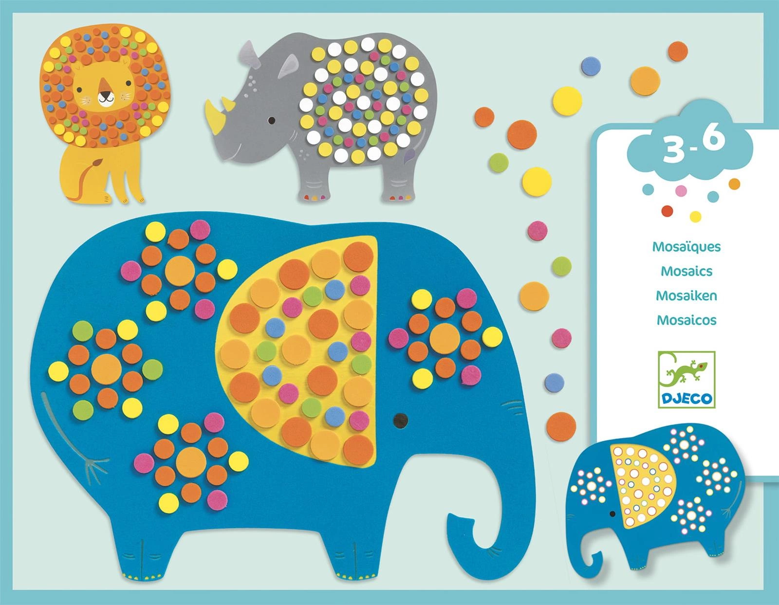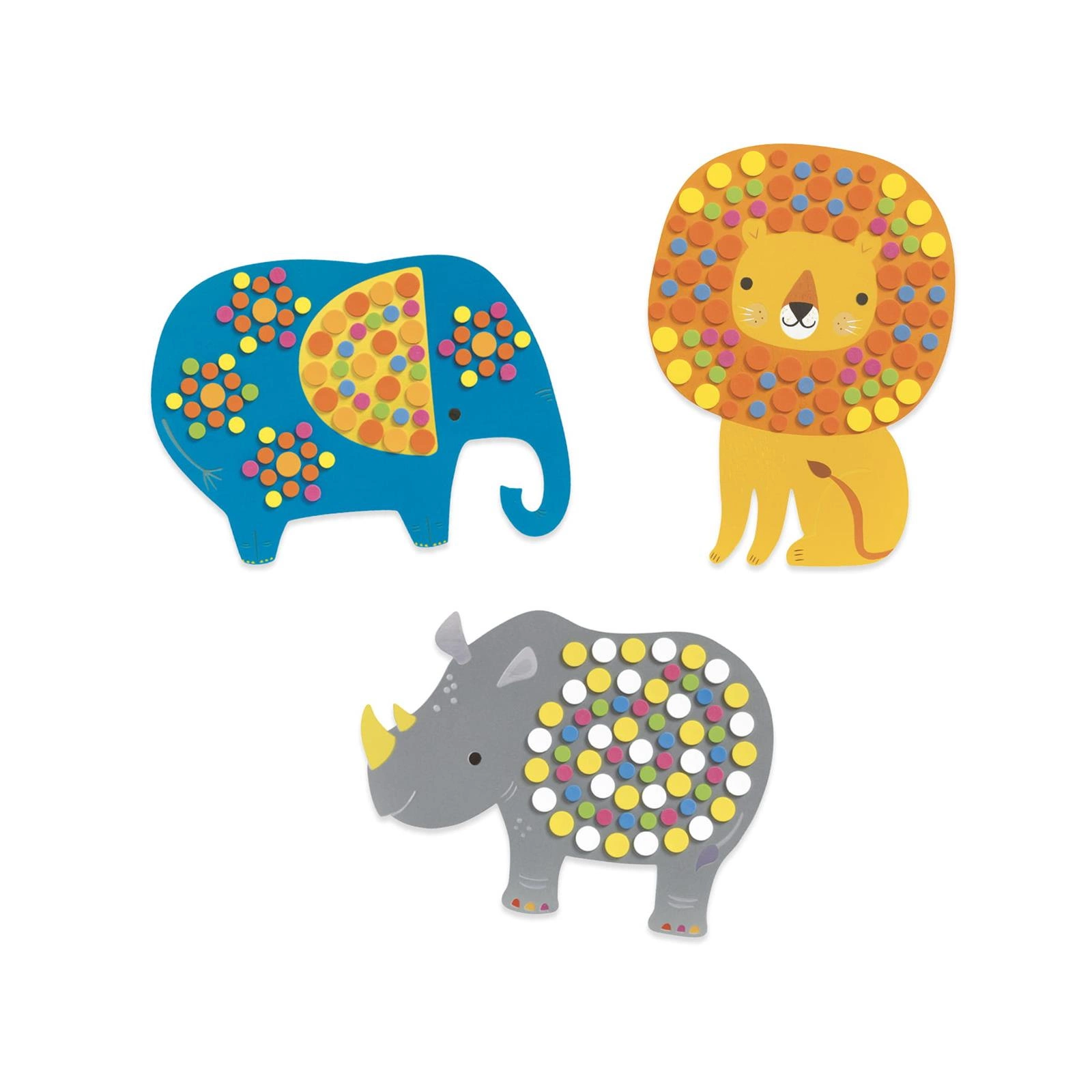 Zestaw do tworzenia mozaiki z naklejkami. Dziecko bawiąc uczy sie kształtów, kolorów i materiałów. Skład : 3 kartonowe postacie zwierzątek do udekorowania, 8 arkuszy okrągłych naklejek piankowych w róznych kolorach i wielkościach.