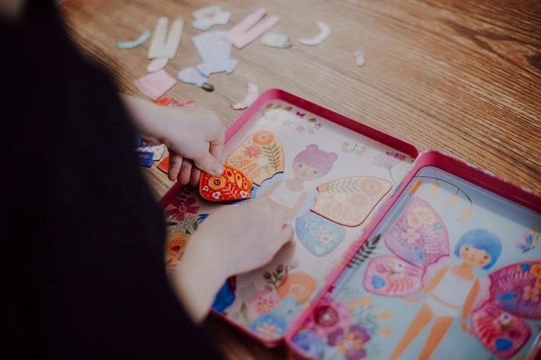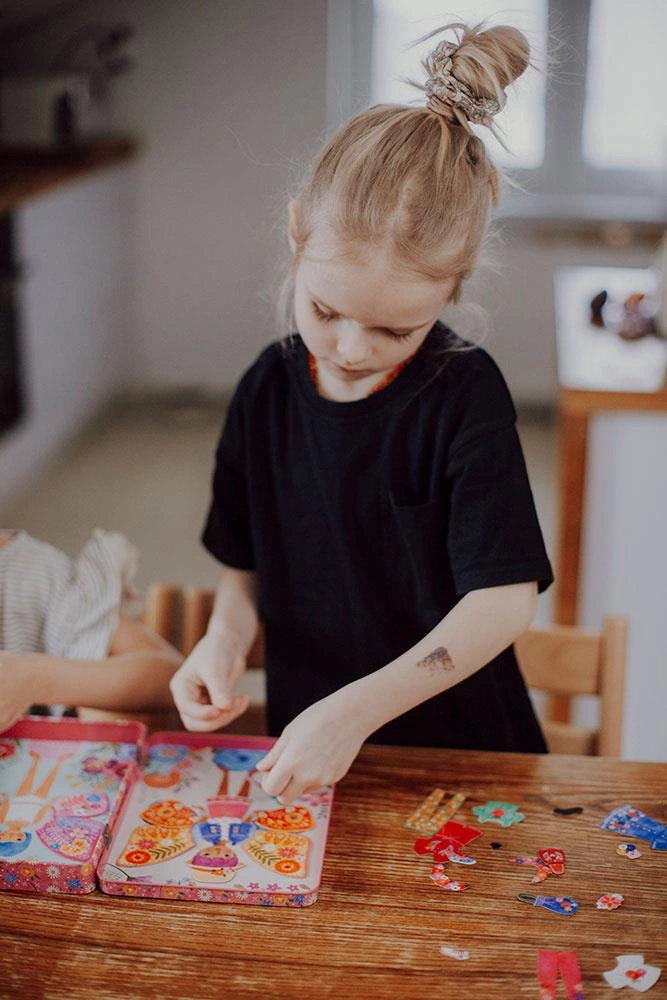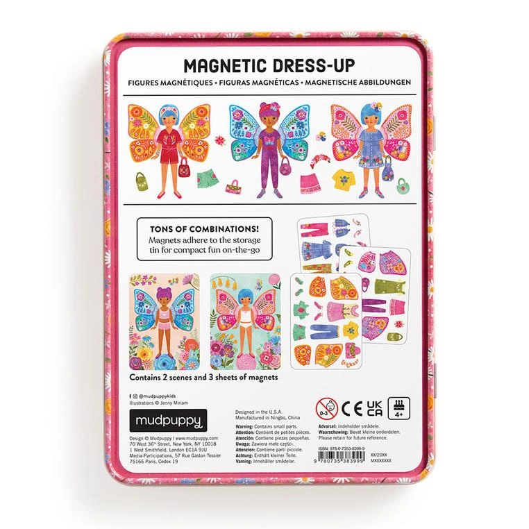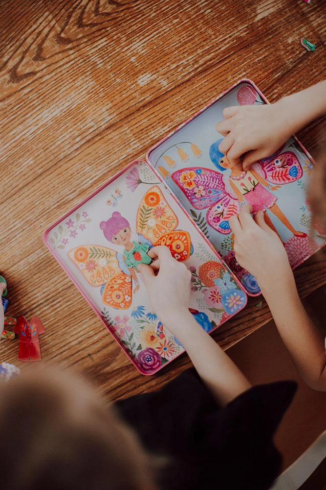 Zestaw magnesów do tworzenia postaci Szczęście motyli amerykańskiej marki MUDPUPPY to wyjątkowo kreatywna zabawka dla dzieci od 4. roku życia. Na dwóch magnetycznych planszach znajdują się postacie: dziewczynki z bajecznie kolorowymi skrzydłami motyli. Można na nich umieszczać wybrane magnesy - elementy garderoby oraz dodatki w różnych wzorach i kolorach (ponad 40 magnesów), tworząc przy tym piękne i modne stylizacje. Zabawka ma poręczny format, sprawdza się w domu i w podróży.