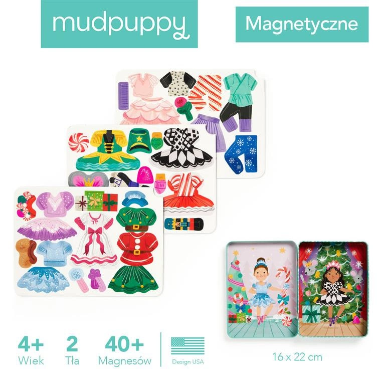 Magnetyczna układanka z zestawem magnesów Zaczarowany dziadek do orzechów amerykańskiej marki MUDPUPPY to wyjątkowo kreatywna zabawka dla dzieci od 4. roku życia. Zabawka ma format metalowego zamykanego pudełka. Na dwóch magnetycznych planszach wewnątrz pudełka znajdują się postacie baletnic na tle pięknej świątecznej scenerii. Można na nich umieszczać magnesy - elementy garderoby oraz scenografii, w tym takie z motywem dziadka do orzechów (w zestawie znajdują się 3 arkusze z ponad 40 magnesami).