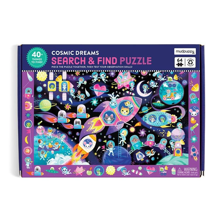 Puzzle obserwacyjne Kosmiczne marzenia amerykańskiej marki MUDPUPPY nadają układaniu nowy wymiar – na samym złożeniu obrazka zabawa się bowiem nie kończy. Układanka o wymiarach 59 x 39 cm składa się z 64 elementów. Po ułożeniu przedstawia galaktyczną przestrzeń, pełną ciał niebieskich i międzyplanetranych podróżników-zwierzątek w rakietach i kombinezonach. To jednak nie wszystko! Na kontrastowym pasku wokół ilustracji znajduje się ponad 40 różnych elementów, które należy odszukać na obrazku, m.in. planety, nietypowe obiekty, lunety czy sondy. Uatrakcyjnia to układanie i trenuje spostrzegawczość.