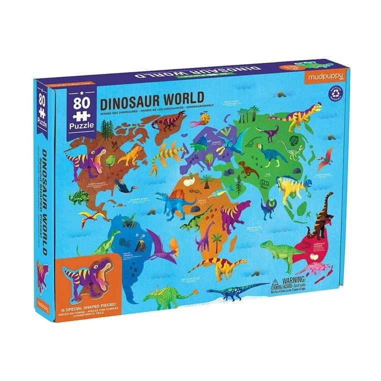 Puzzle edukacyjne Świat dinozaurów amerykańskiej marki MUDPUPPY to 80-cio elementowa układanka, w której 15 klocków ma kształt dinozaurów, umiejscowionych w rejonach, w których występowały. Ułożenie całej mapy pomaga dziecku poznać wszystkie kontynenty i przyporządkować do nich odpowiednie gatunki prehistorycznych stworzeń (niektóre są już naniesione na mapę). Do zestawu dołączony jest plakat z przedstawicielami i nazwami 33 gatunków dinozaurów. Wyjątkowy design i przyjazne barwy dodatkowo zachęcają dziecko do zabawy. Puzzle zapakowane są w estetyczne pudełko. Idealnie nadają się na prezent.