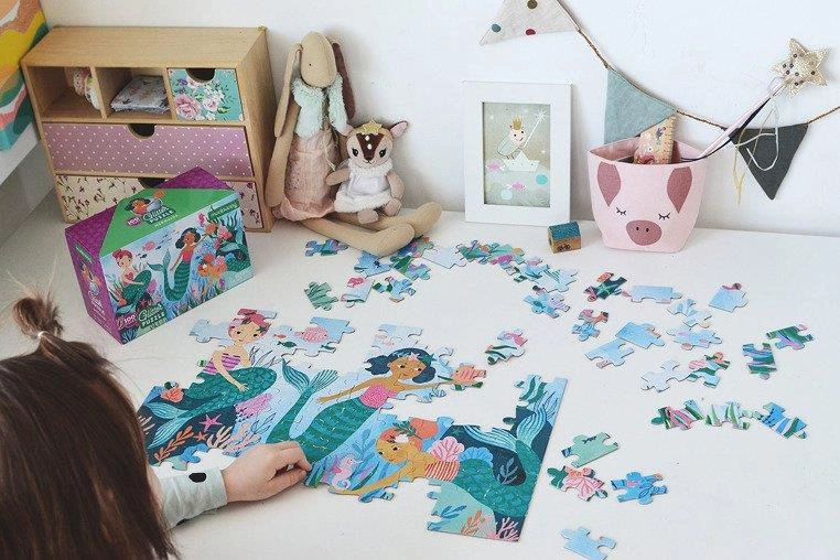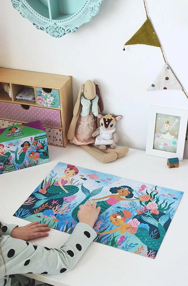 Puzzle z brokatem Syrenki amerykańskiej marki MUDPUPPY nadają układaniu puzzli nowy wymiar – na samym złożeniu obrazka zabawa się bowiem nie kończy. Układanka składa się ze 100 elementów, po ułożeniu przedstawiających trzy syrenki pod powierzchnią oceanu. To jednak nie wszystko. Łuski na ich ogonach, rozgwiazdy i niektóre rybki wokół nich... błyszczą! Są bowiem pokryte brokatem. Autorką ilustracji jest mieszkająca w Australii angielska graficzka Rebecca Jones. Puzzle zapakowane są w estetyczne pudełko. Idealnie nadają się na prezent.