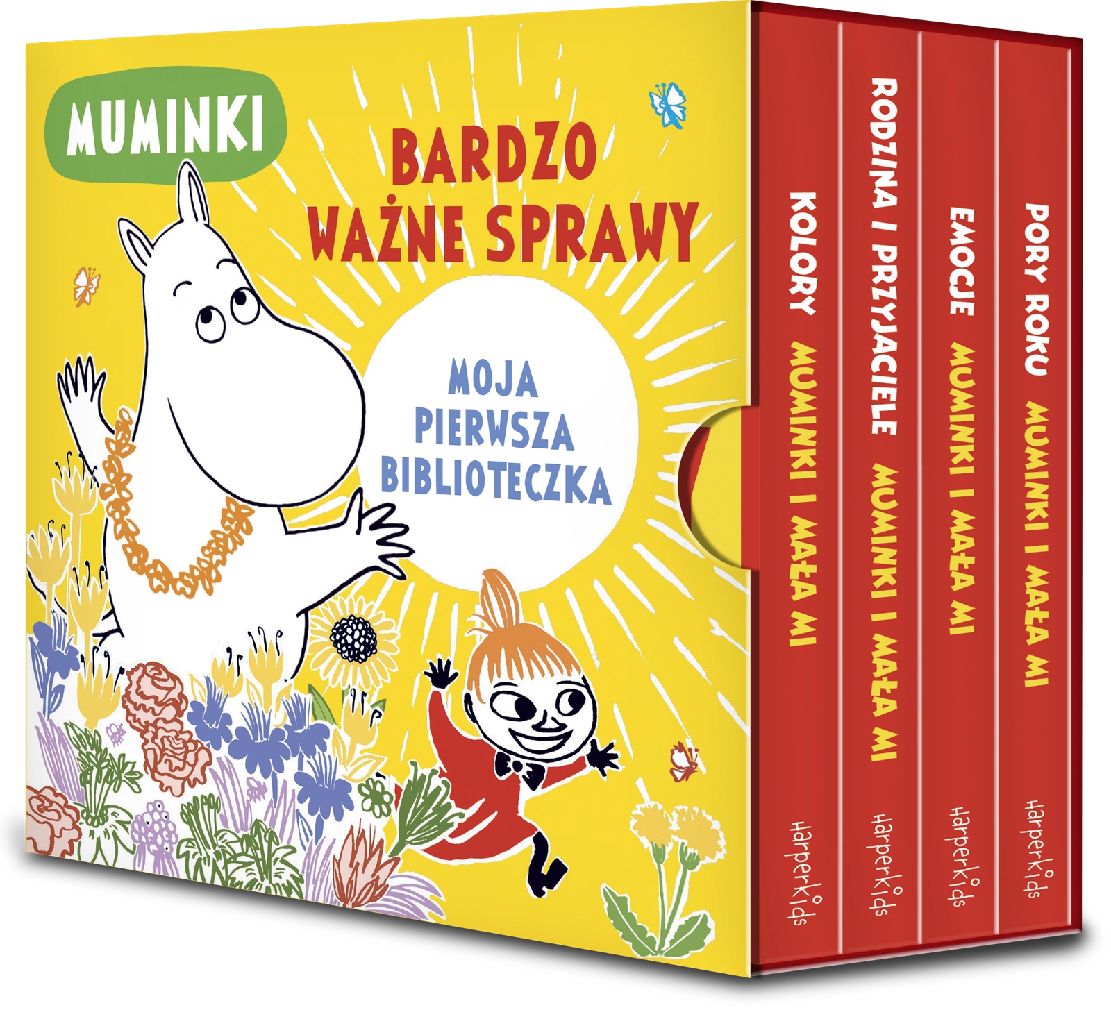 „Muminki. Bardzo ważne sprawy. Moja pierwsza biblioteczka” to 4 wdzięczne kartonowe książeczki w pięknym etui. Każda książka, której format pasuje w sam raz do małych rączek, poświęcona jest innej tematyce - kolorom, rodzinie i przyjaciołom, emocjom oraz porom roku. Wszystkim tym ważnym tematom towarzyszą przepiękne ilustracje w klimacie Tove Jansson. Książeczki są malutkie - kilkulatek może je z dumą „czytać" samodzielnie, oglądać bez końca i zabrać ze sobą na spacer albo w podróż. Dzięki zaokrąglonym rogom są one bezpieczne dla maluchów.
