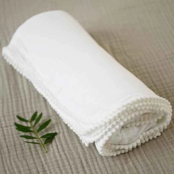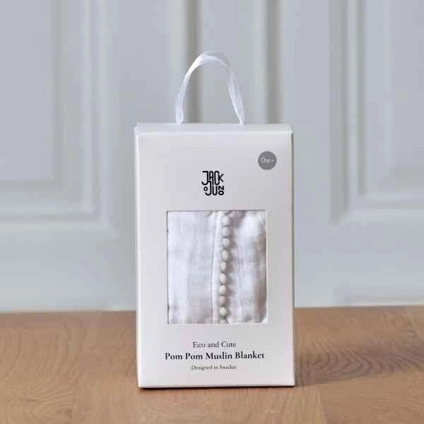 Niezwykle delikaty i przyjemne w dotyku muślinowy kocyk, otulacz skandynawskiej marki JackOJuno- w kolorze białym perłowym z uroczym pomponikami. Idealnie dostosowany do potrzeb niemowląt. Mięciutki i milutki otulacz spełni oczekiwania najbardziej wymagających, wykonany z bamusa i bawełny organicznej.