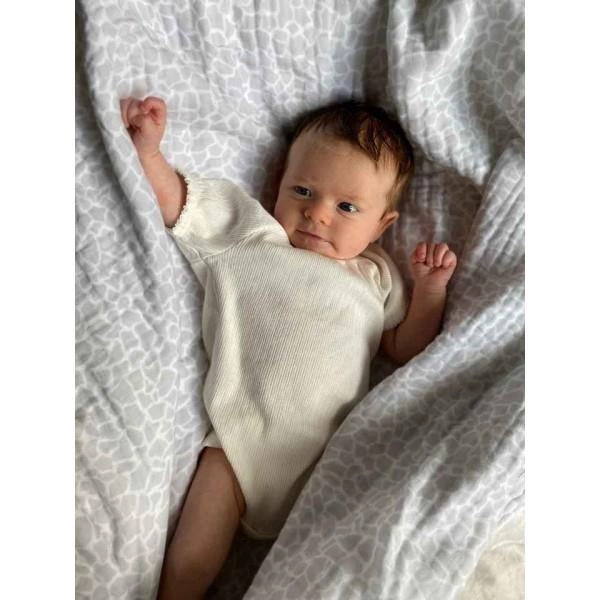W zestawie znajduje się jeden otulacz w kolorze biało – szarym ze wzorem żyrafy, charakterystycznym dla skandynawskiej marki JackOJuno.