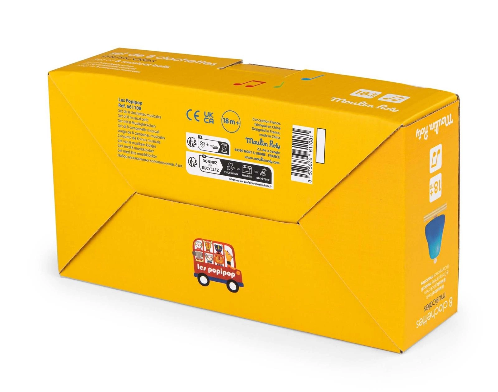 Zestaw 8 metalowych dzwonków w kolorach tęczy z kolekcji Les Popipops. Instrument dla dzieci, które zaczynają swoją przygodę z muzyką. Na dwóch drewnianych podkładkach znajdują się po cztery dzwonki. Do zestawu dołączone są pałeczki oraz karty z nutami. Dzieci wygrywają melodie uderzając pałeczkami w poszczególne dzwonki.