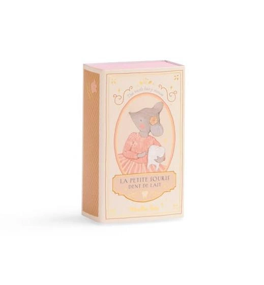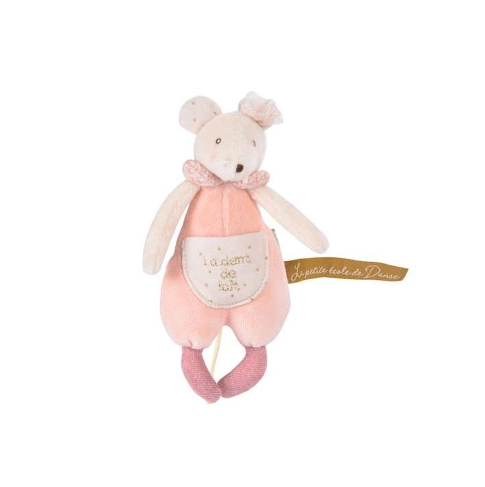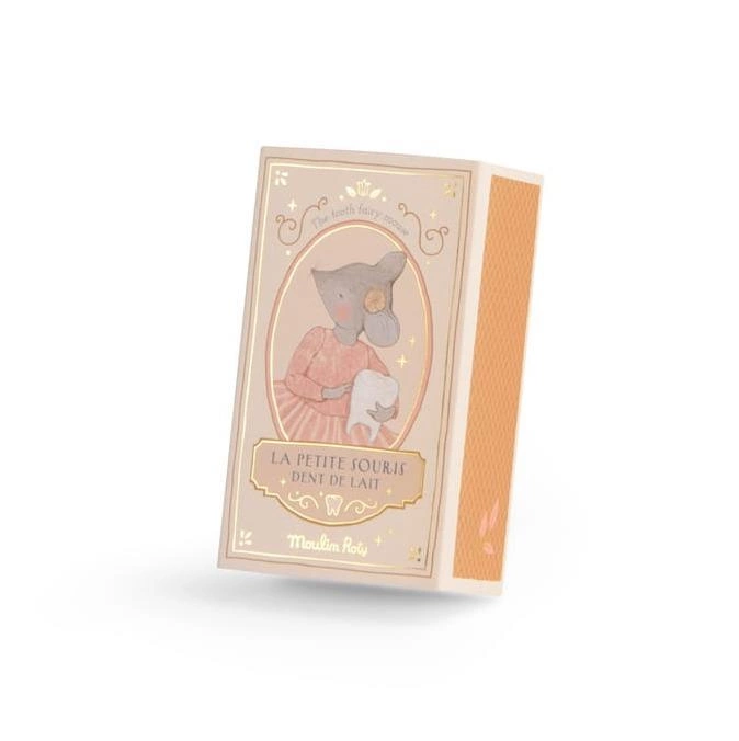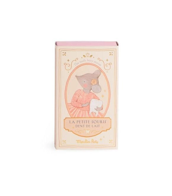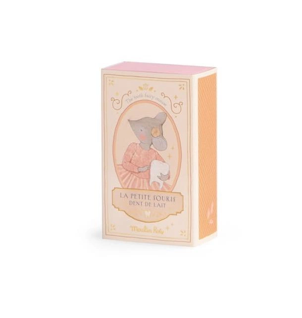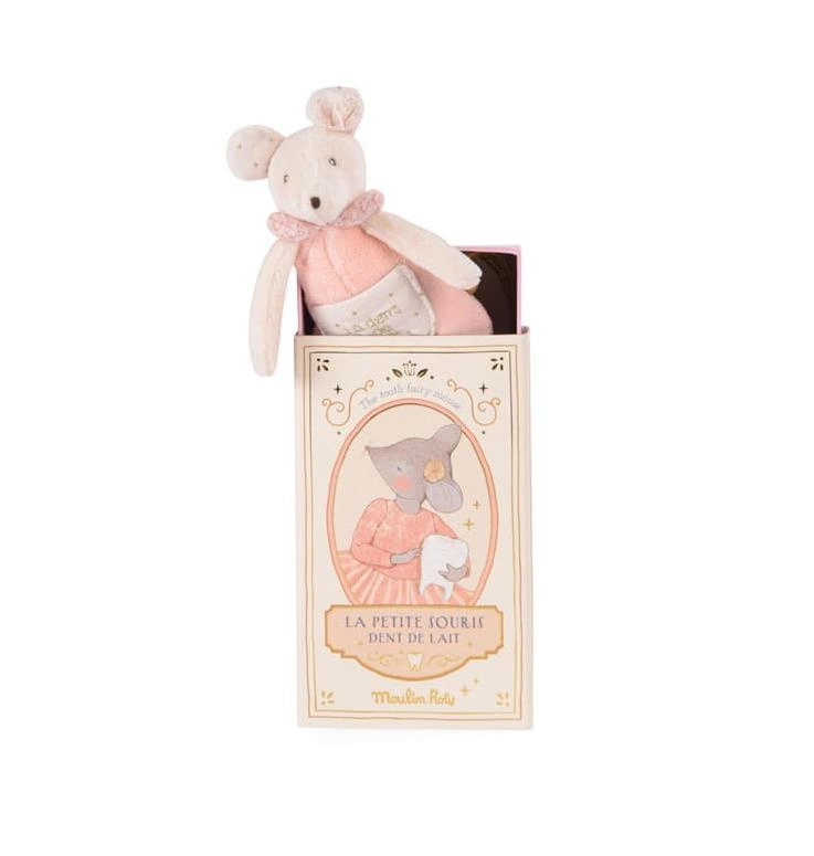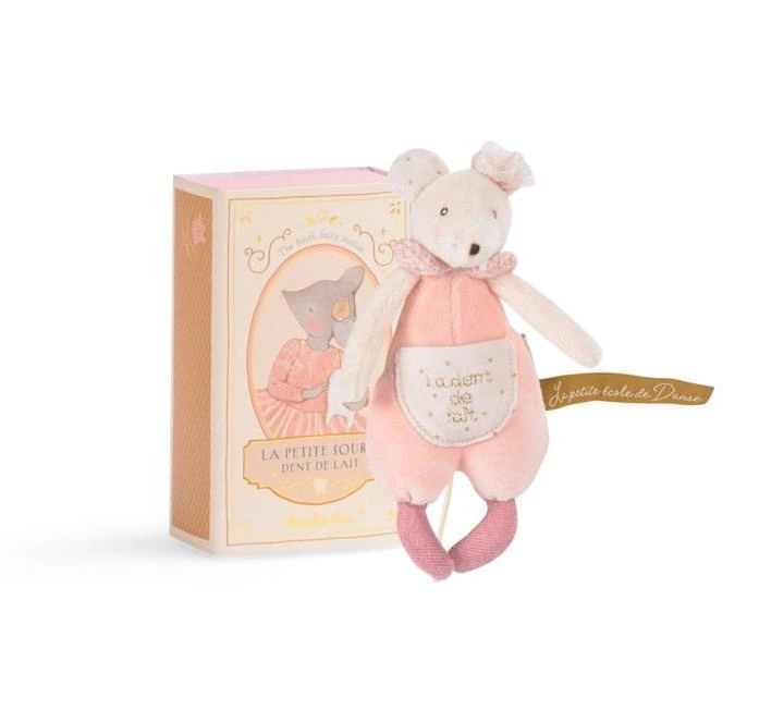 Urocza mała myszka Moulin Roty z kolekcji "Mała szkoła tańca" pilnuje mlecznych ząbków w kieszonce ze złotym haftem, dopóki nie pojawi się wróżka!