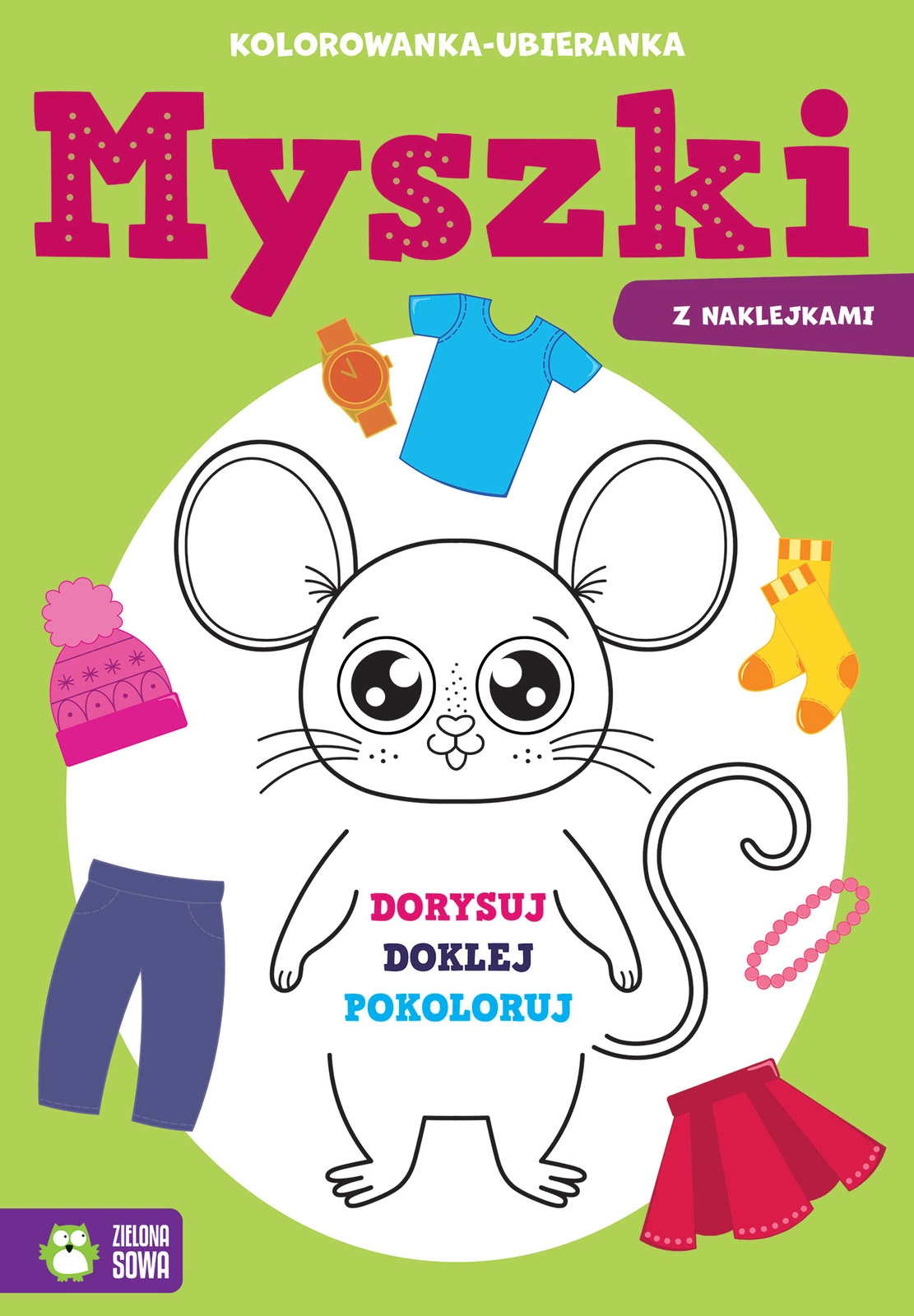 Wesołe kolorowanki z dodatkową aktywnością. Najpierw dziecko ma za zadanie dorysować zwierzątku ubranie, a następnie pokolorować ilustrację i ozdobić ją naklejkami.