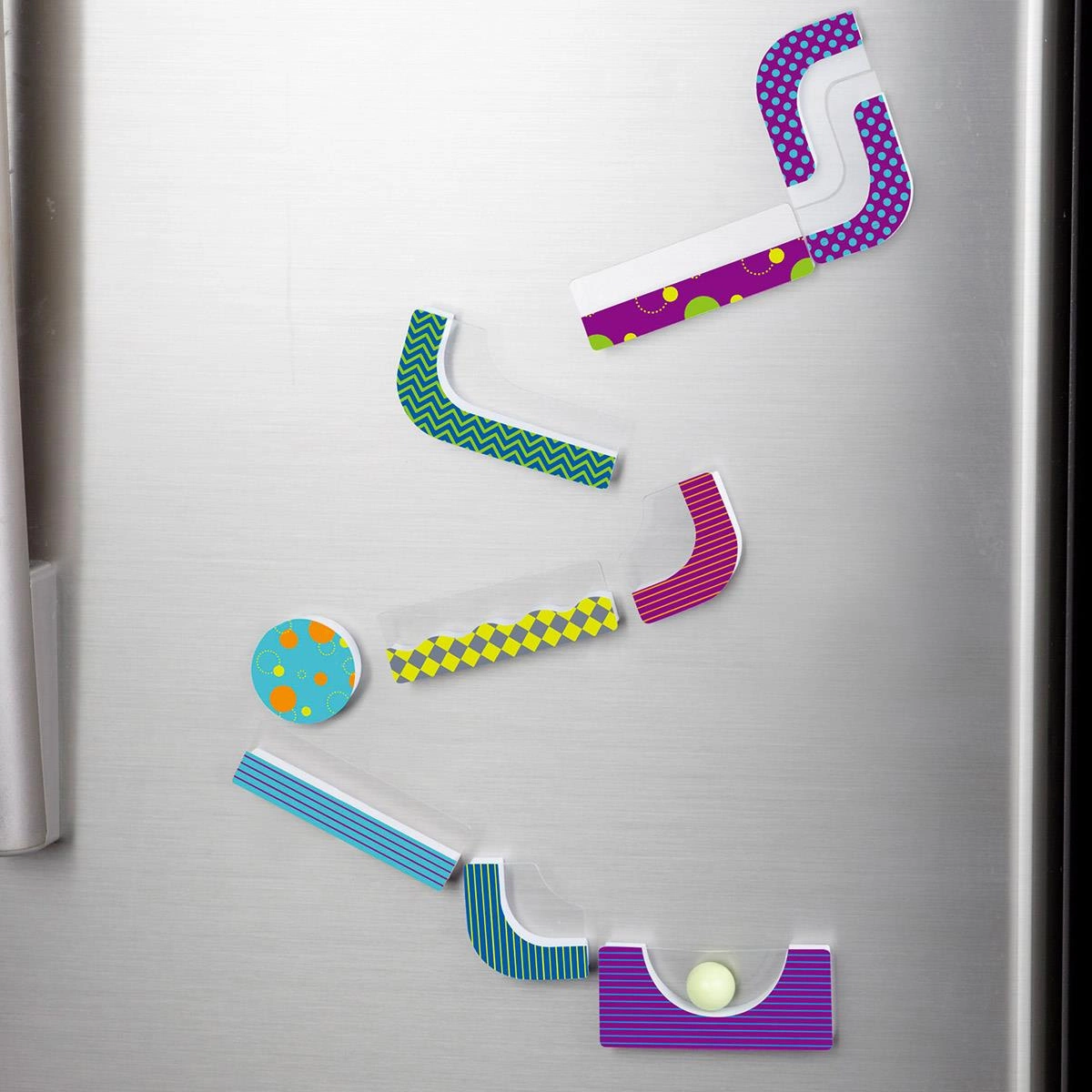 Innowacyjna zabawka Marble Runners, którą można wielokrotnie naklejać na płaskie powierzchnie. Pionowy tor dla spadających kulek to wielka frajda tak podczas budowania jak i podczas zabawy. Zawarte w zestawie elementy konstrukcyjne o różnej długości i kształcie umożliwiają zbudowanie zwariowanego toru dla kulek - wystarczy lekko zmienić kąt nachylenia toru, aby kulka potoczyła się w zupełnie innym kierunku. Jeden zestaw daje setki możliwości budowy toru - dzięki temu zabawa jest doskonałą okazją do nauki myślenia przyczynowo - skutkowego i ćwiczenia wyobraźni przestrzennej. Modułowe zestawy można układać według własnych pomysłów. Kulodrom można również w prosty sposób rozbudować.