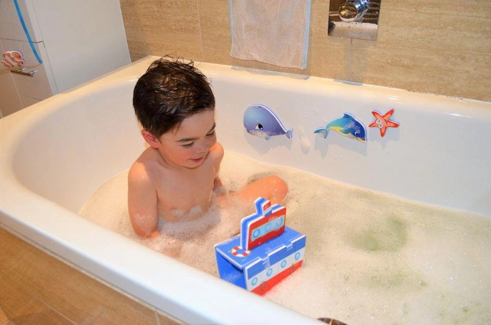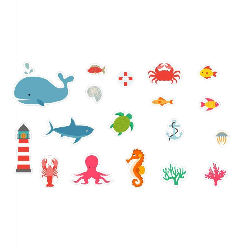 Zestaw zawiera 18 naklejek i siatkę. Siatka sprawia, że po zakończonej zabawie łatwo utrzymać zabawki w porządku. Wystarczy schować elementy do siatki i przyczepić do płytek, aby wyschły. Siatka wyposażona została w uchwyt na górze i dwie przyssawki. W tym zestawie znajdziecie naklejki tworzące morski krajobraz.