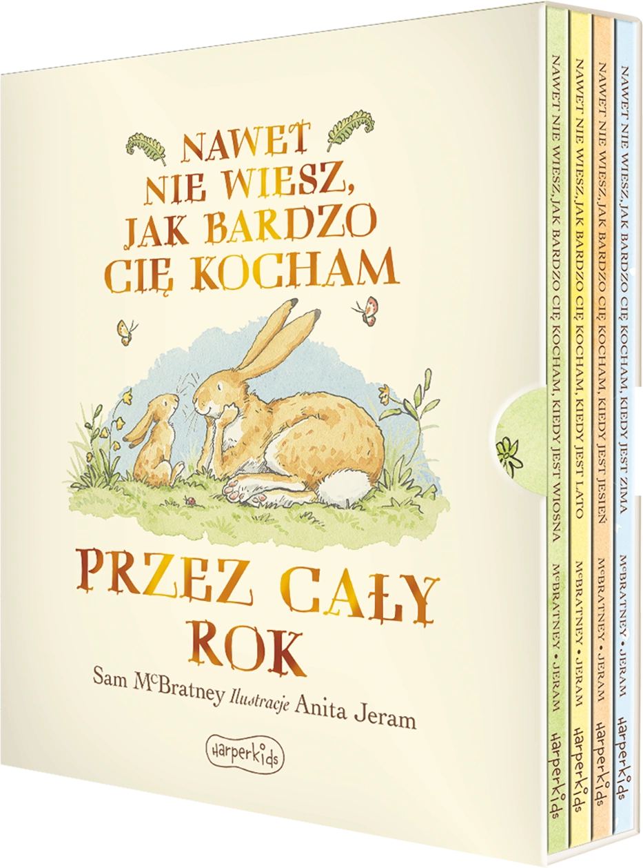 Niezwykła kolekcja czterech książek z bestsellerowej serii „Nawet nie wiesz, jak bardzo cię kocham” w nowym, złoconym etui prezentowym! To przepiękne, wyjątkowe pudełko zawiera wydane wcześniej osobno książki: - Nawet nie wiesz, jak bardzo cię kocham, kiedy jest wiosna, - Nawet nie wiesz, jak bardzo cię kocham, kiedy jest lato, - Nawet nie wiesz, jak bardzo cię kocham, kiedy jest jesień, - Nawet nie wiesz, jak bardzo cię kocham, kiedy jest zima. Opowieści autorstwa Sama McBratneya i Anity Jeram o Małym Brązowym Zajączku i Dużym Brązowym Zającu, ze zmieniającymi się porami roku w tle, są mądre, zabawne i porywające. To najlepszy prezent urodzinowy lub świąteczny, który z pewnością zachwyci każde dziecko!