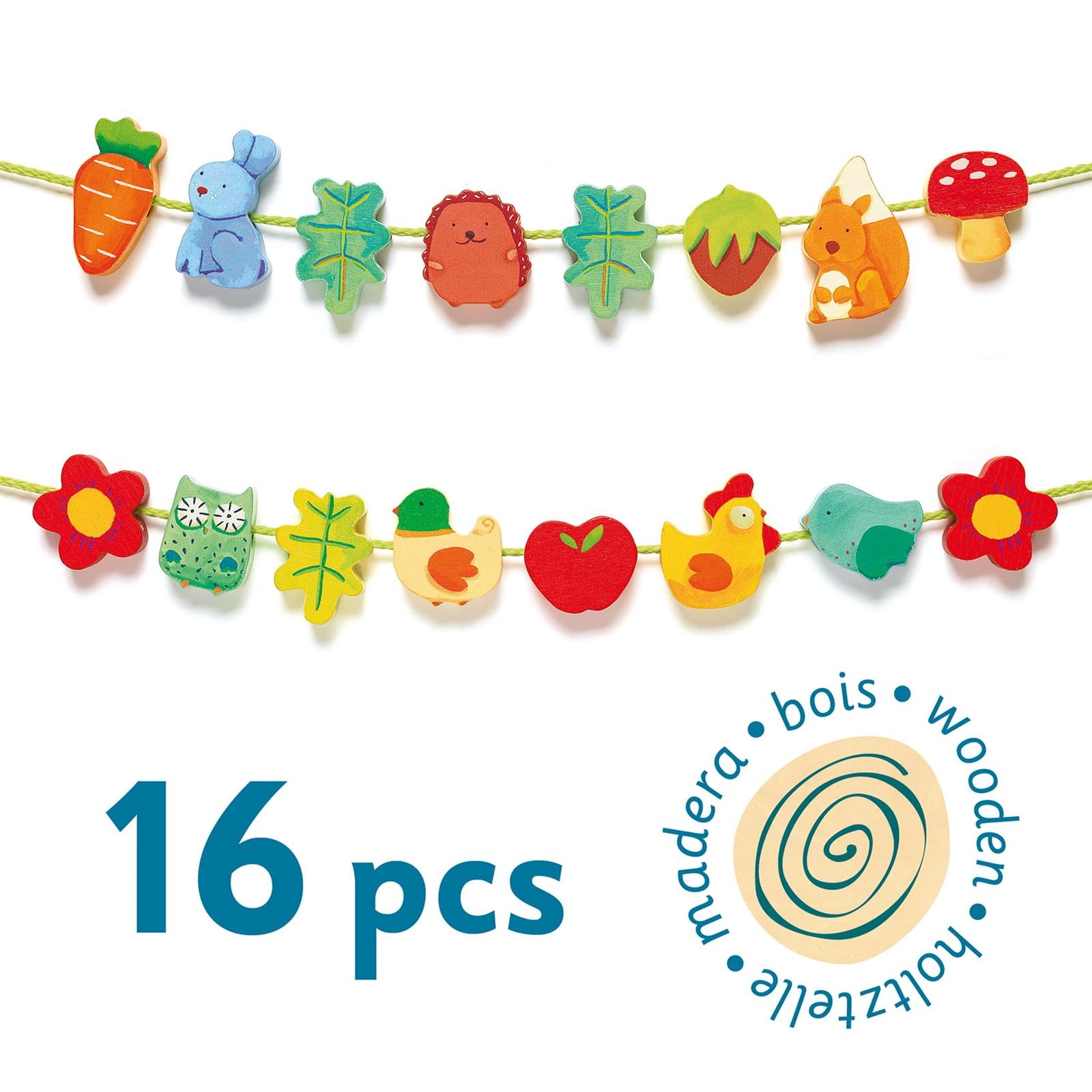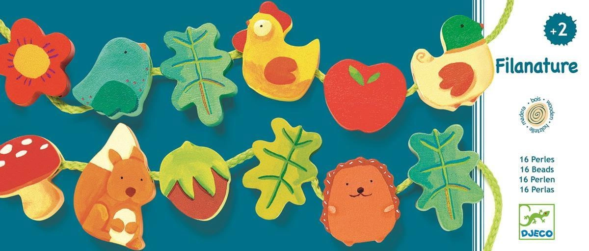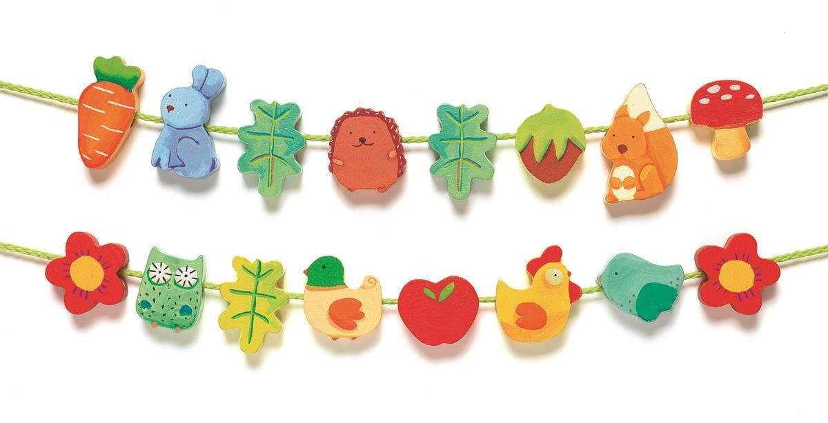 Ten zestaw to wspaniała zabawa z nawlekaniem drewnianych elementów! 16 kolorowych elementów z drewna w kształcie zwierzatek, liści , owoców i innych elementów leśnych zapewni mnóstwo kreatywnej zabawy. Ćwicząc sprawność małych paluszków można z nich wykonać kolorową girlandę.