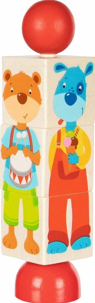 Drewniane klocki obrotowe, uczą dziecko wyobraźni przestrzennej, poznawania kształtów i kolorów, wspomagają małą motorykę u maluszka. Kolorowe zwierzaki odkryją przed nimi sylwetki wesołych zwierzątek. Zadaniem dziecka jest odpowiednie obrócenie trzech sześcianów, które utworzą całość zwierzątek, takich jak np: miś, kot, nosorożec, owieczka, pies czy żyrafa.