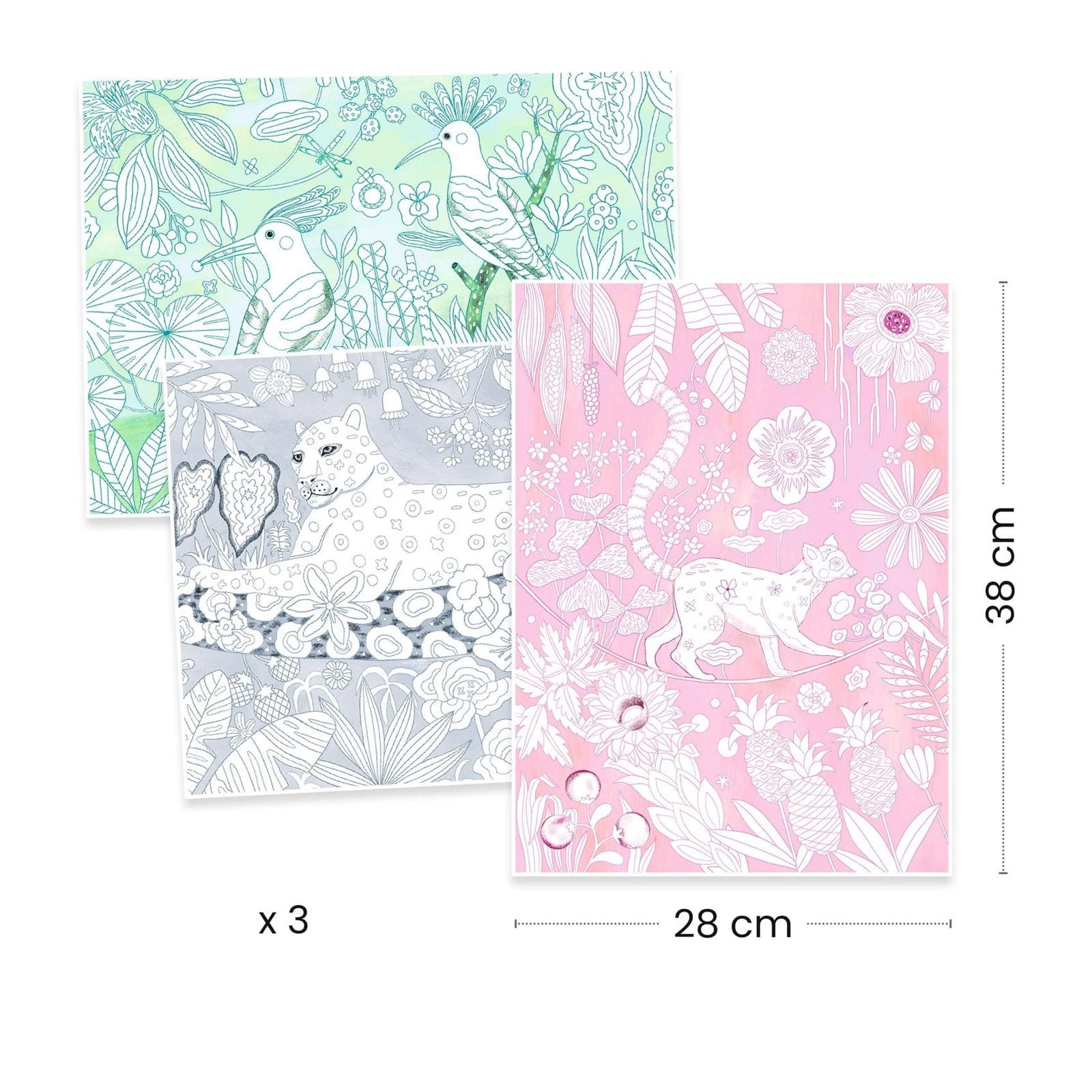 Zestaw 3 dużych kolorowanek w formie obrazów dla starszych dzieci i dorosłych! Zanurz się w bujnej dżungli zamieszkałej przez dzikie zwierzęta. Tło arkuszy jest w dwóch odcieniach, z białymi elementami motywów do pokolorowania.