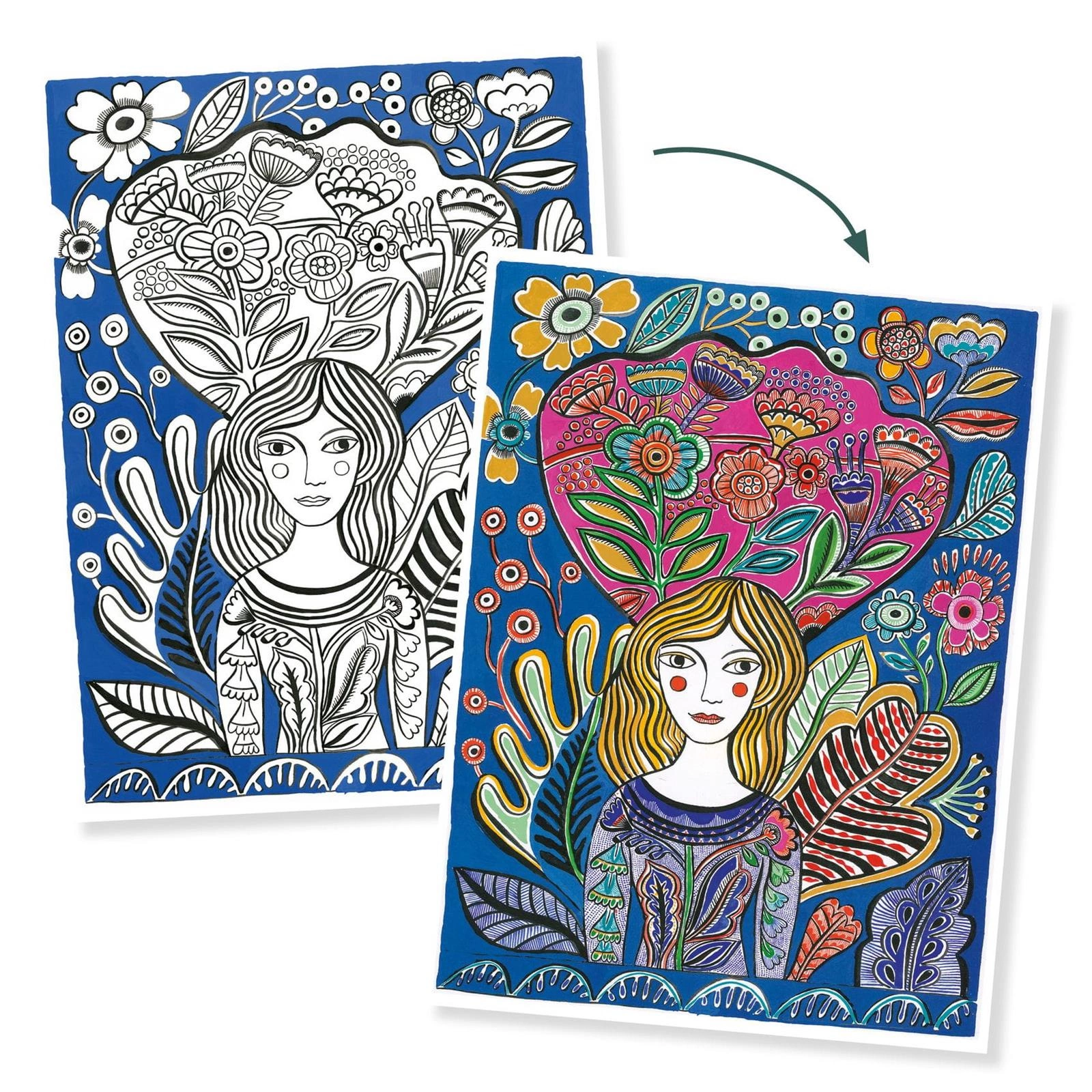 Arkusze są zapakowane w ozdobną teczkę, w której można bezpiecznie przechowywać swoje dzieła. Każdy obraz będzie unikatowy, w zależności od wizji autora.
