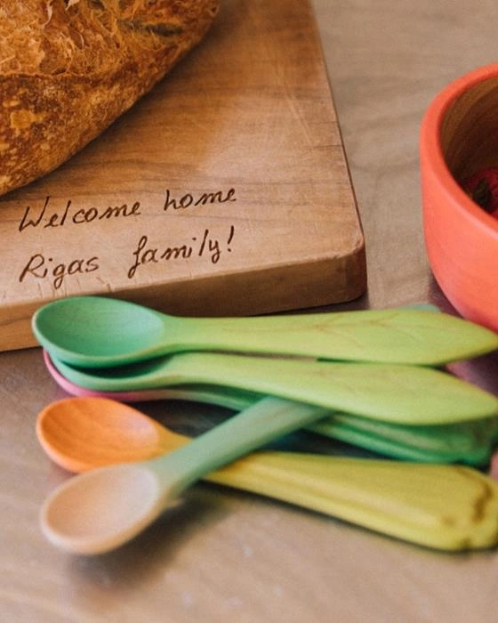 Bezpieczny od pierwszego kęsa – zestaw sztućców dla niemowląt bez plastiku! Łyżeczki Por Luk i Jarmuż Kendall to mega-uroczy zestaw sztućców dla dzieci, który skradnie serca maluchów i ich rodziców. Wykonany ręcznie z drewna kauczukowca Hevea, daje drugie życie drzewom, które wcześniej podarowały nam kauczuk do produkcji gryzaków Oli & Carol.