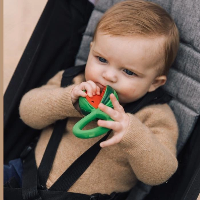 Nowa, rewolucyjna koncepcja! Zabawka dla niemowląt 2w1: gryzak i grzechotka – jedna z NAJEKOLOGICZNIEJSZYCH NA ŚWIECIE! Zewnętrzna część Arbuza wykonana jest w 100% z naturalnego kauczuku, a w środku znajdują się przetworzone pestki wiśni, które zamieniają gryzak w grzechotkę. 2 w 1!