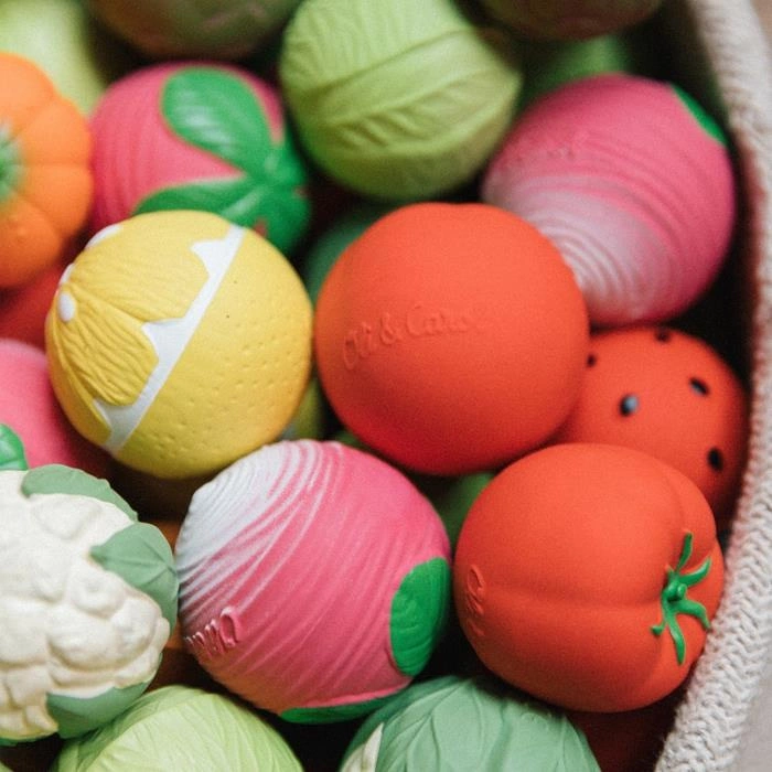 Świeża porcja wegetariańskiej zabawy! Zestaw piłek sensorycznych dla niemowląt Sałatka jarzynowa zawiera trzy mini piłki — to nasze bestsellerowe modele: rzodkiewka, pomidor i kapusta.