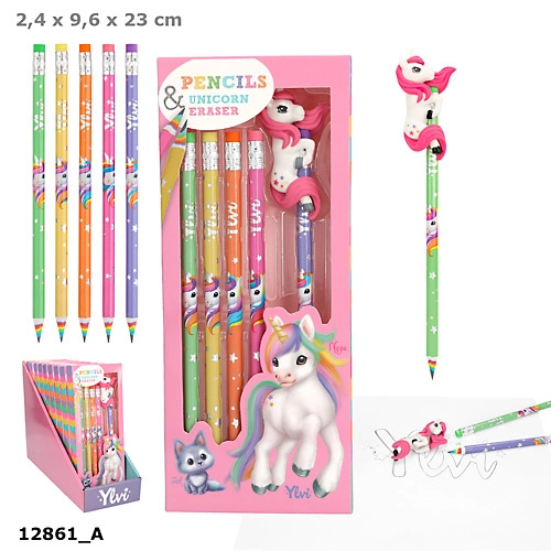 Zestaw pięciu tęczowych ołówków Jednorożec Ylvi, w zestawie pięć ołówków z gumką i jedna figurka Jednorożec nakładana na ołówki.