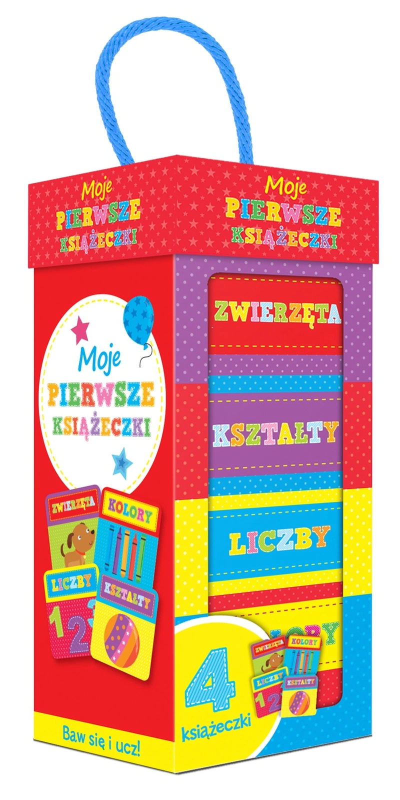 i kształtów. Książeczki spakowane są w kolorowym i praktycznym pudełku na sznureczku, dzięki czemu dziecko może je wszędzie zabrać ze sobą.