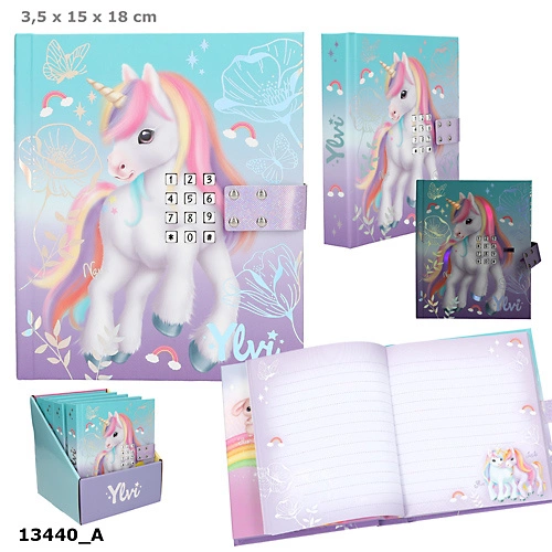 Pamiętnik na kod Jednorożec Ylvi na najskrytsze zapiski, po otwarciu przez chwilę słychać magiczną melodię i podświetla się kilka elementów na okładce. W środku polska instrukcja, wymienne baterie.