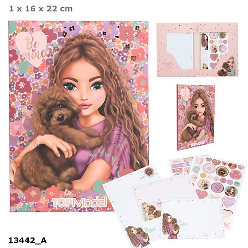 Papeteria w teczce Top Model, w zestawie 24 ozdobne kartki w dwóch wzorach, 12 kopert i 3 strony z naklejkami.