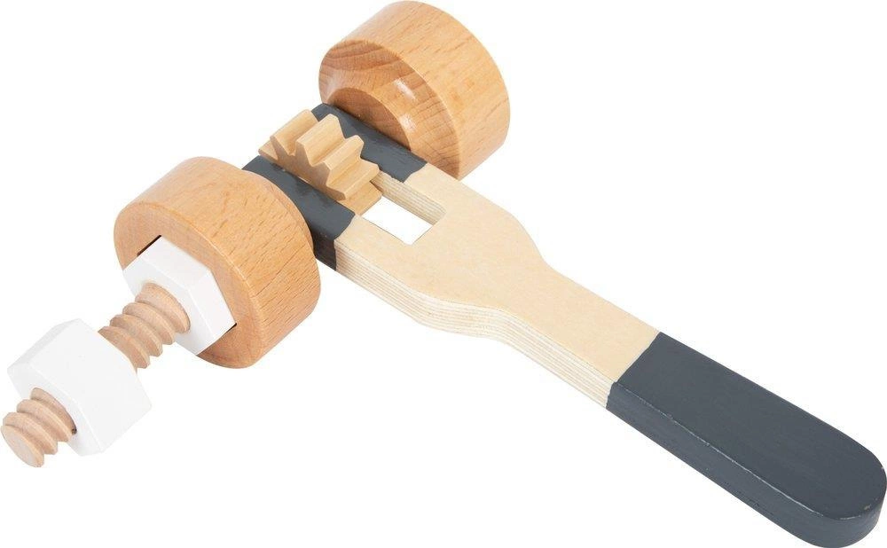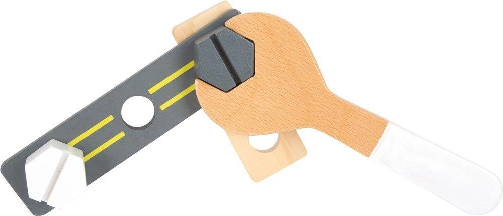 Regulowany pas z drewnianymi narzędziami w klasycznych kolorach. Dzięki niemu niezbędne akcesoria małego majsterkowicza są zawsze w zasięgu ręki. Absolutnymi atrakcjami w zestawie są klucz do rur oraz grzechotka!
