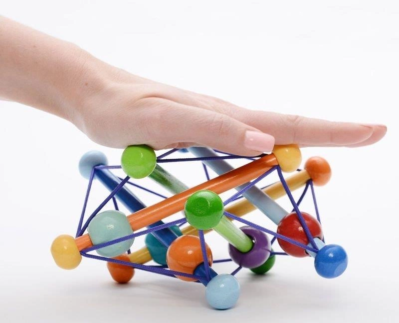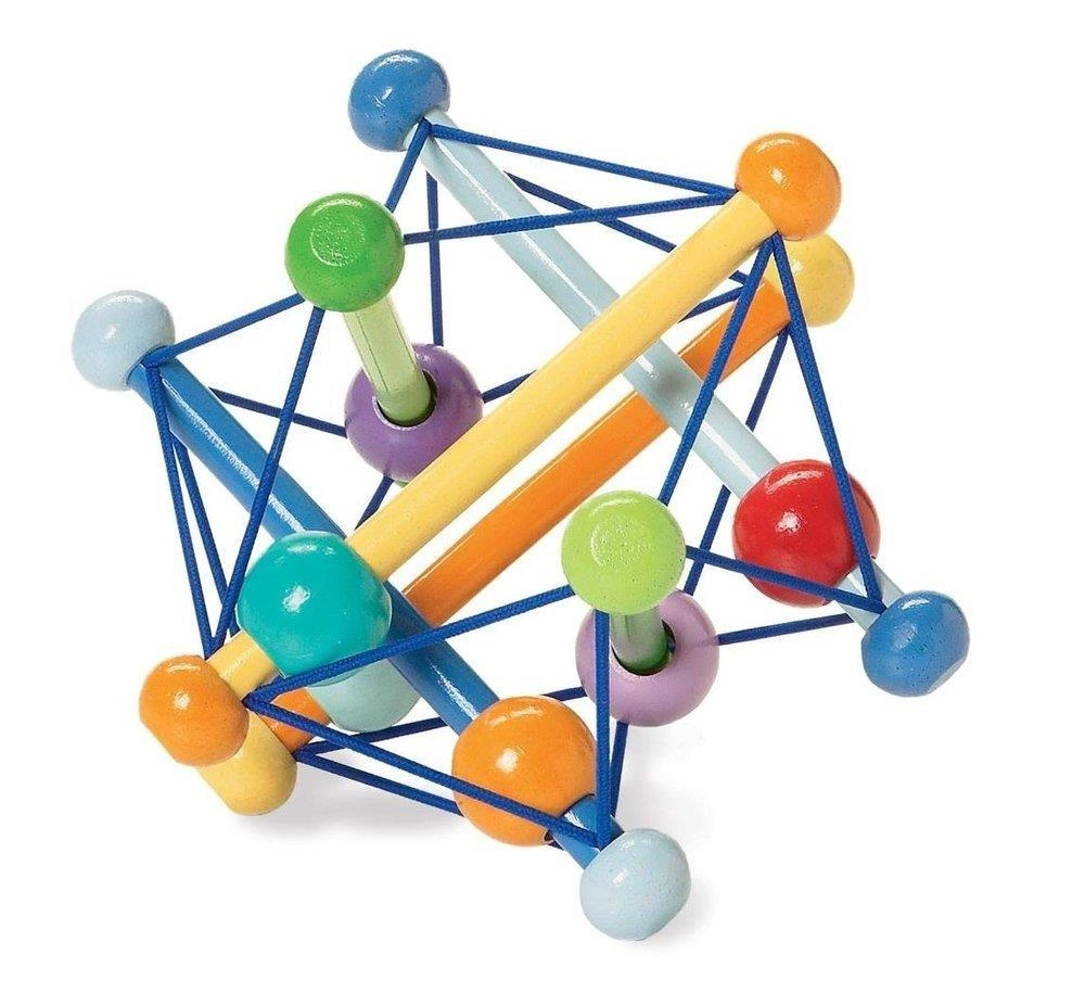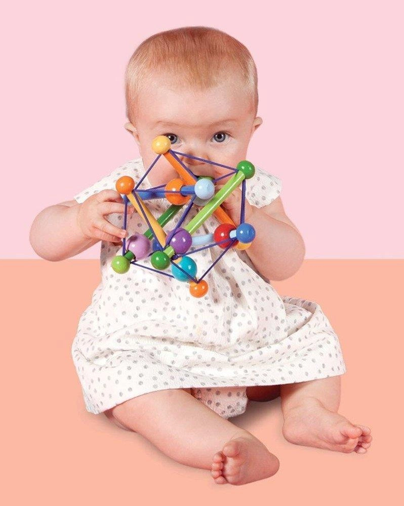 Pastelowa bryła - zabawka dla maluchów od Manhattan Toy zawsze powraca do swojej wyjściowej formy. Można nią dowolnie manipulować, zgniatać. Korale ślizgają się delikatnie przy tym grzechocząc. Zabawka wykonana jest z odnawialnych źródeł drewna kauczukowego i wykończona farbami na bazie wody (nietoksyczne).