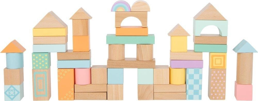 Zestaw składa się z 50 drewnianych klocków w pastelowych kolorach. Tworzenie konstrukcji zachwyca młodych, aspirujących mistrzów budownictwa. W zestawie odnajdą duży wybór różnie ukształtowanych klocków. Zabawka wspiera rozwój zdolności motorycznych. Klocki są wykonane z wysokiej jakości drewna.