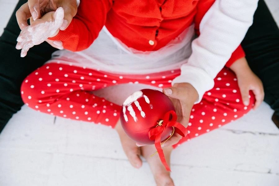 Zestaw zawiera w 100% bezpieczną dla dziecka białą farbę, dzięki której wykonasz odcisk dłoni swojego malucha. Po prostu pokryj dłoń dziecka farbą, a następnie przyłóż ją do bombki, aby stworzyć Wasz własny i niepowtarzalny wzór. Pozostaw bombkę do wyschnięcia na 12-24 godziny. Użyj dołączonego do zestawu markera, aby napisać imię dziecka, albo pozwól maluszkowi podpisać się samodzielnie. Gdy farbka i marker wyschną, przymocuj czerwoną satynową wstążkę. Twoja bombka z odciekiem rączki jest już gotowa, możesz zamiesić ją na choince!