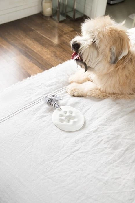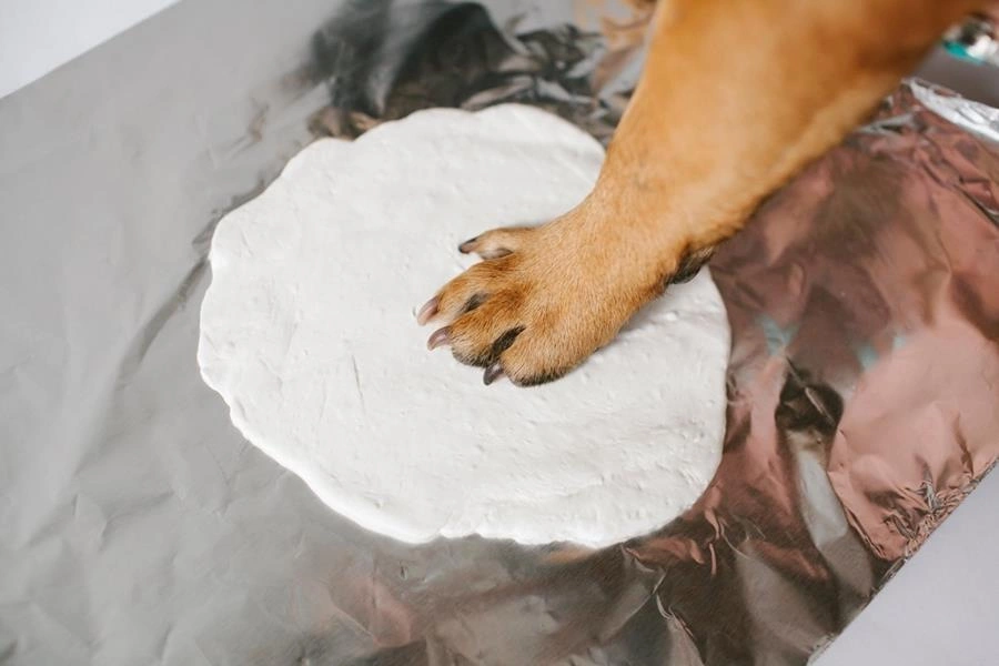 Zagnieść glinę, rozwałkować, zmoczyć łapę zwierzaka, delikatnie wcisnąć łapę zwierzaka w glinę, wyciąć odcisk pierścieniem do nadawania kształtu, zrobić otwór na wstążkę do zawieszenia i usunąć nadmiar gliny. Susz na powietrzu 1-2 dni. Użyj wstążki, aby powiesić pamiątkę w dowolnym miejscu.
