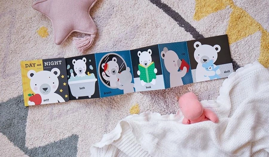 Książka w twardej oprawie ma zaokrąglone rogi i solidne kartki składane w harmonijkę, które rozkładają się, ukazując pierwsze słowa i piękną wyraźną grafikę. Książeczka jest dwustronna i ukazuje elementy dnia po jednej i nocy po drugiej stronie.