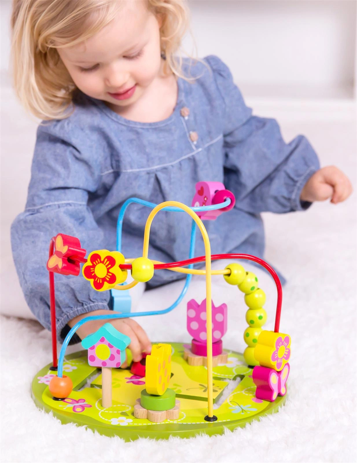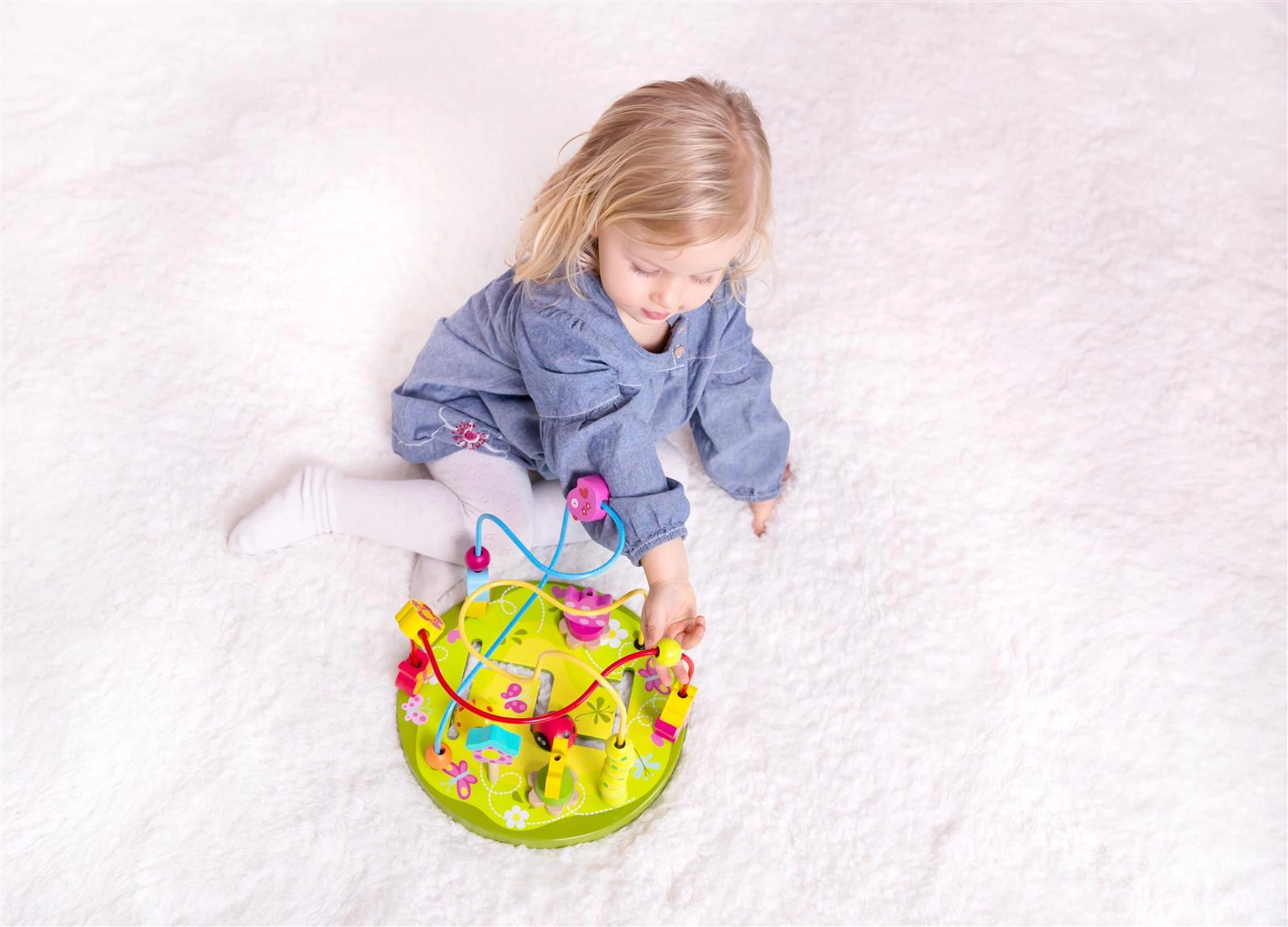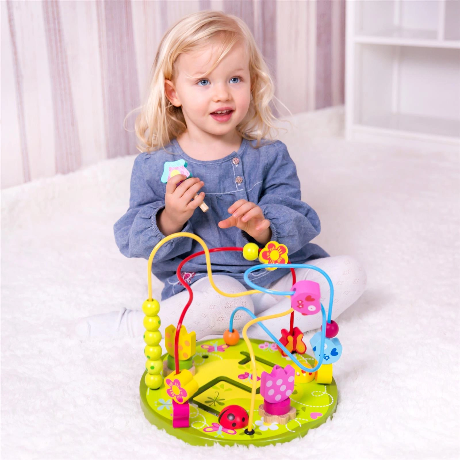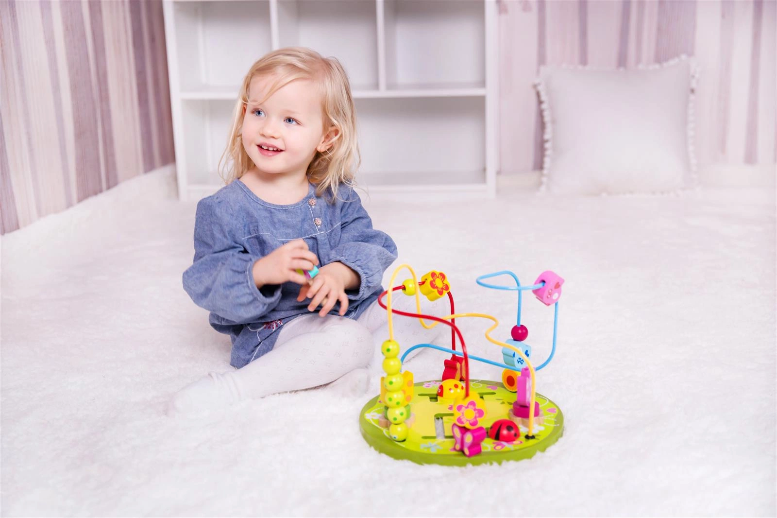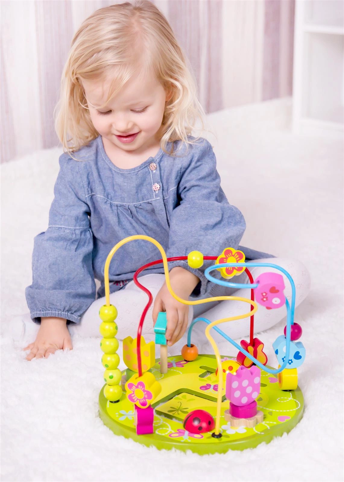- - Na metalowych kolorowych prętach znajdują się piękne drewniane koraliki, którymi dziecko może przesuwać w dowolny sposób, ćwicząc przy tym precyzję ruchów palców i dłoni.