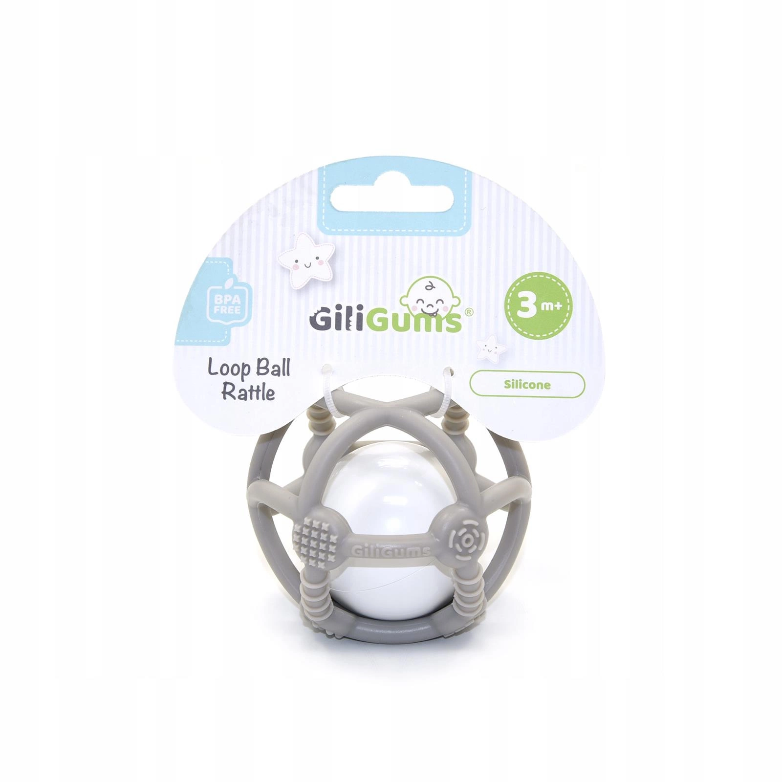 Piłka grzechotka szara - GiliGums Urocza piłeczka w szarym kolorze, łączy w sobie funkcje zabawki, gryzaka oraz grzechotki! Wyposażona została w wypustki, które podczas gryzienia, delikatnie masują obolałe dziąsła, przynosząc ulgę ząbkującemu maluchowi. Kształt piłeczki został idealnie dopasowany do małych rączek, co ułatwi dziecku chwytanie zabawki. Gryzak wesoło grzechocze przy potrząsaniu.