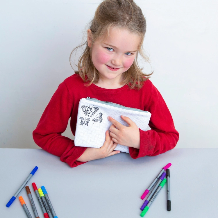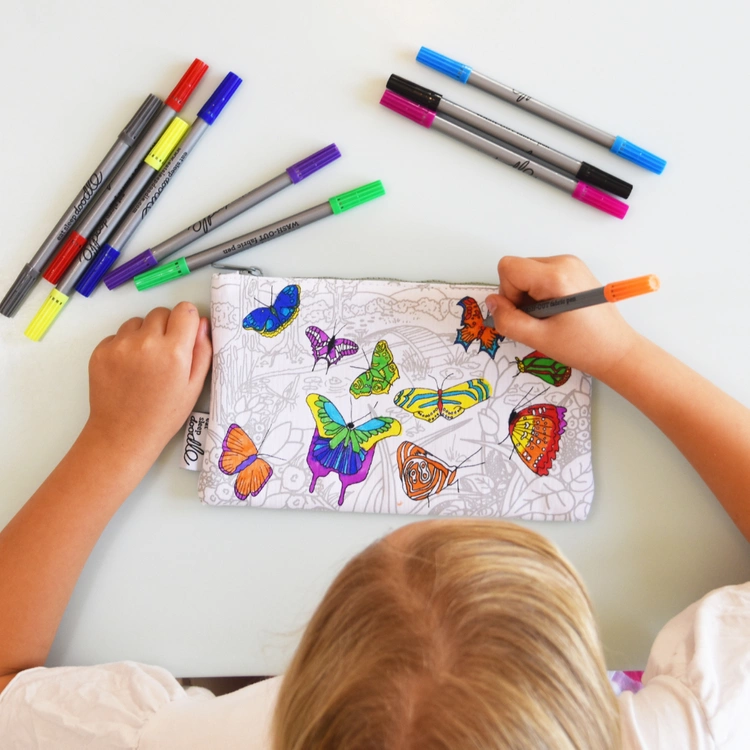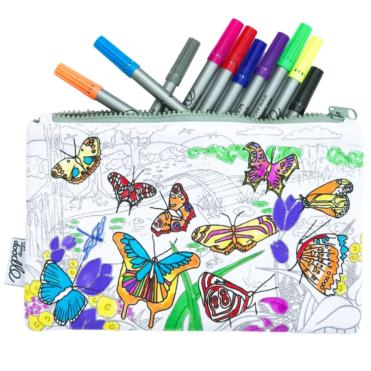 Piórnik do kolorowania z motylami i 10 zmywalnych pisaków do tkanin. Na jednej stronie znajdują się motyle z całego świata, a na drugiej miejsce, które można wypełnić swoimi własnymi ilustracjami tych skrzydlatych owadów.