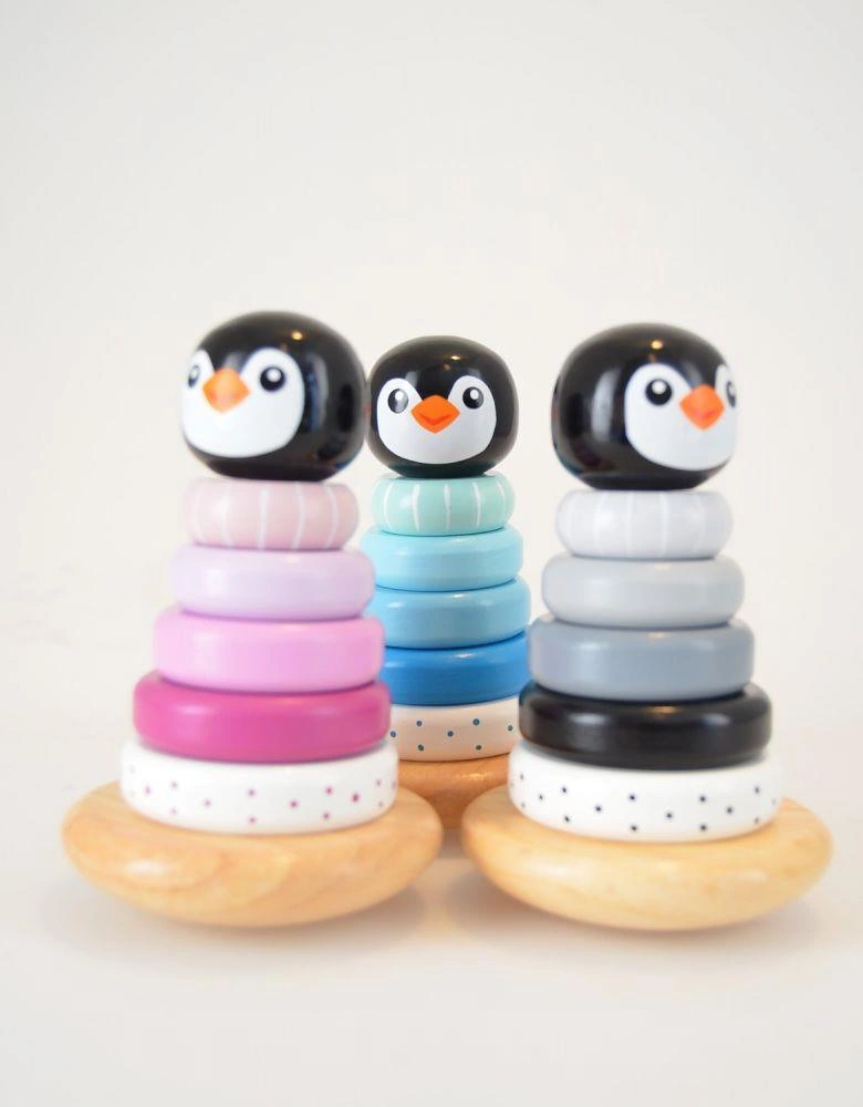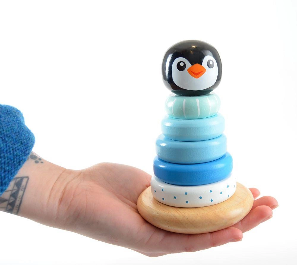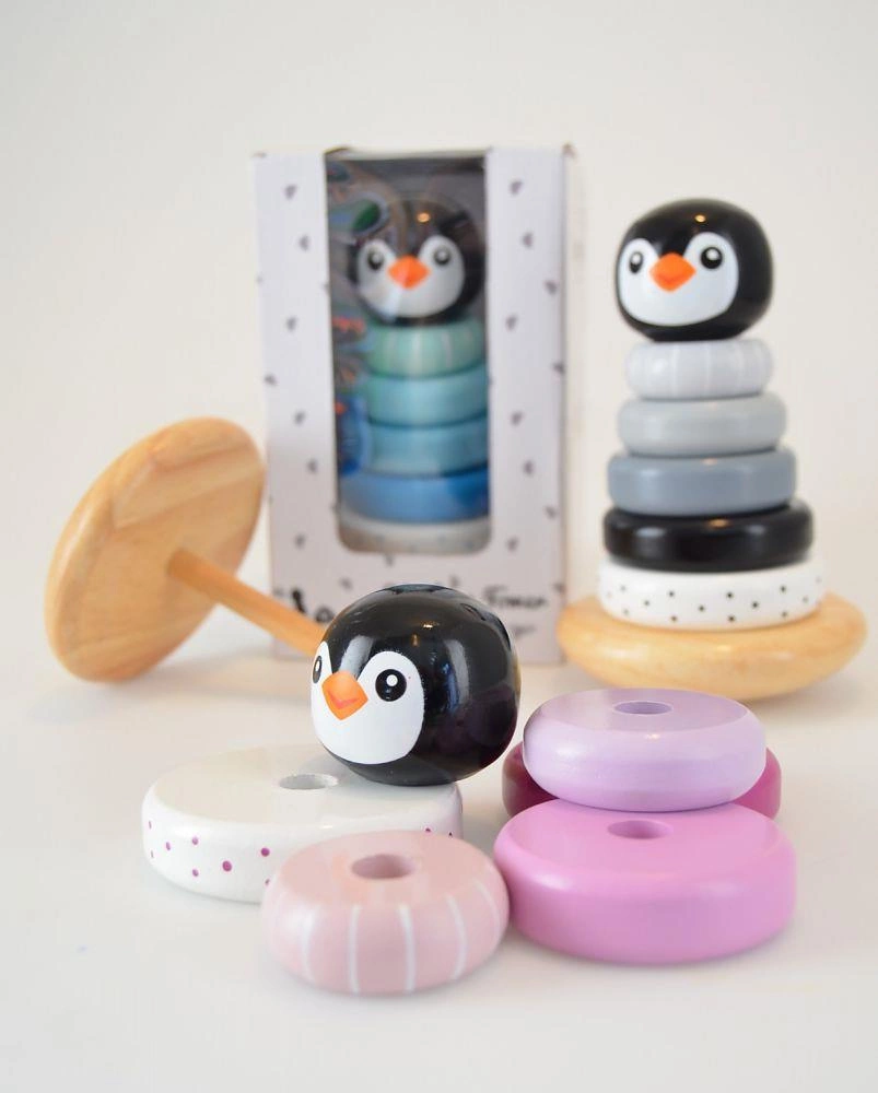 Zestaw składa się z drewnianej podstawki z przymocowanym palikiem, 5 dysków o różnych rozmiarach oraz okrągłej główki pingwinka. Kolorystyka pingwinka to w szczególności odcienie niebieskiego i zielonego a także czarna główka z sympatycznym dziobkiem pingwinka.