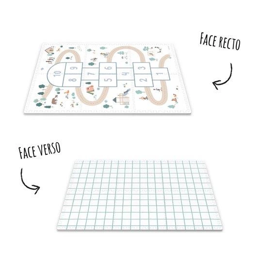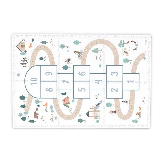 - mata do zabawy - duża, dwustronna powierzchnia: z jednej strony kolorowy wzór gry w klasy, z drugiej - spokojny, stylowy motyw pasujący do każdego wnętrza.