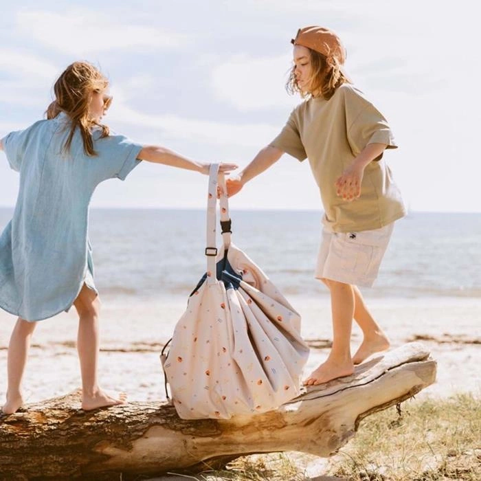 Worek na zabawki oraz mata do zabawy 2 w 1 przeznaczona do użytku w domu i na zewnątrz. Rozwiązanie stworzone z myślą o kreatywnej, swobodnej zabawie także na powietrzu – w parku, na plaży, kempingu czy podczas pikniku. Dla dzieci i dorosłych! Na macie Play&Go, jak na plażowym kocu, można siedzieć, leżeć lub radośnie się bawić, ale dzięki jej wodoodpornym właściwościom (materiał water-resistant) nawet, gdy podłoże jest wilgotne, pozostaniesz suchy! Czas wracać? Tu plażowa mata odkrywa kolejne swoje zalety. Dzięki niej sprzątanie rzeczy, ich przenoszenie i przechowywanie nigdy nie było tak praktyczne i łatwe, jak teraz. Wystarczy pociągnąć za sznurki, a mata do zabawy szybko zamieni się w worek do przechowywania zabawek, plażowych akcesoriów, ubrań lub innych skarbów. Dopinamy pasek i przerzucamy naszą piknikową lub plażową torbę przez ramię. Proste! Dodajmy, że na czas zabawy, piknikowania lub opalania sznurki zabezpieczamy, więc dzieci mogą bawić się na macie bezpiecznie.