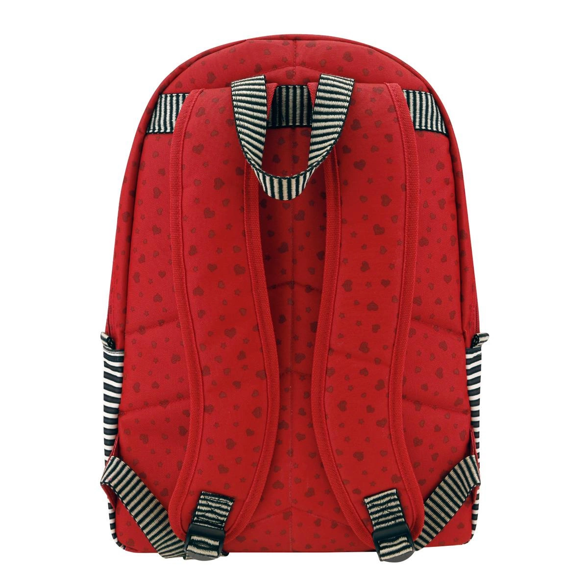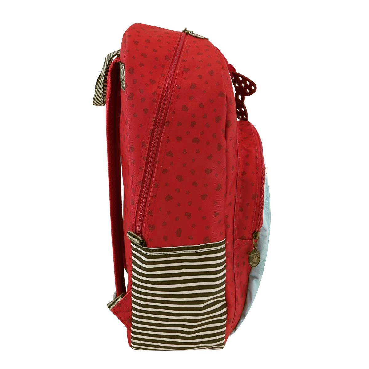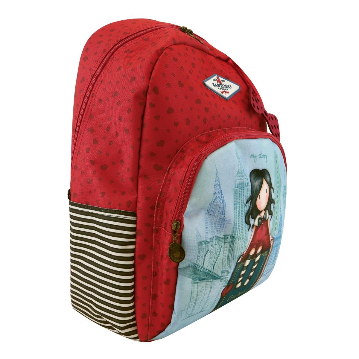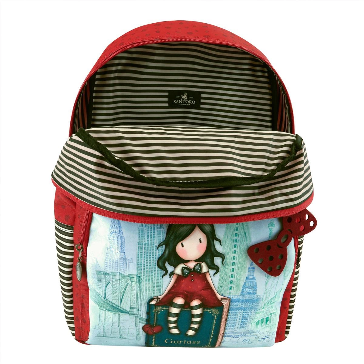 - Wyjątkowo praktyczny i piękny plecak z wizerunkiem dziewczynki Gorjuss w odcieniach czerwieni rubinowej i głębokiego turkusu.