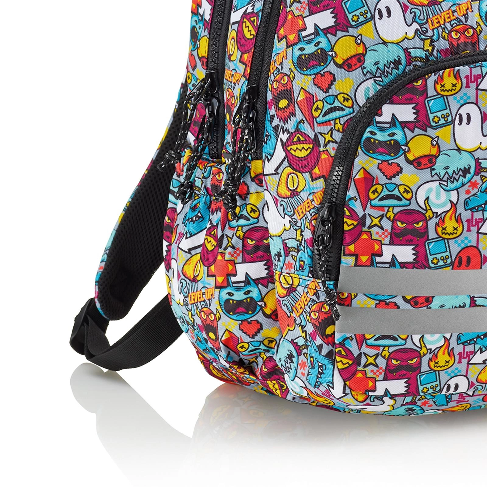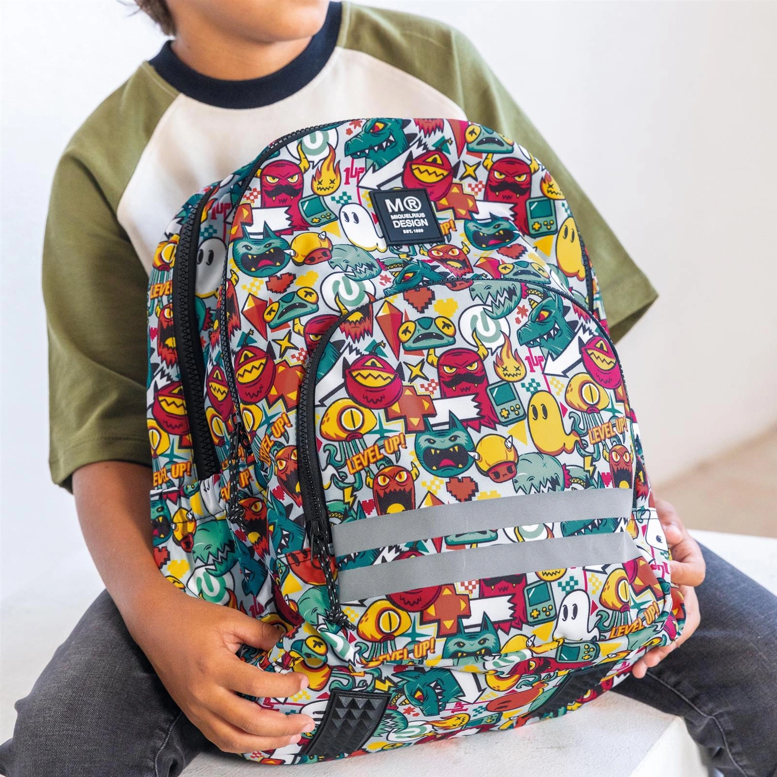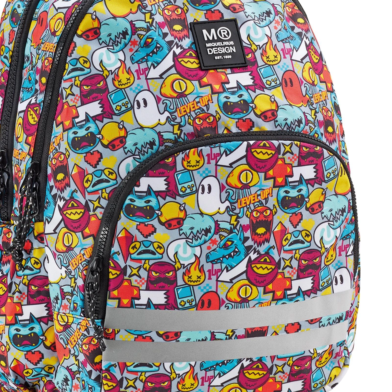 Duży plecak trzykomorowy marki Miquelrius z motywem zabawnych, kolorowych stworków sprawdzi się dla dzieci w wieku szkolnym. Plecak posiada trzy komory: dwie główne i jedną przednią, co ułatwia organizację i zapewnia równomierne rozłożenie ciężaru. Jego pojemność wynosi aż 27 litrów, oferując dużo miejsca na wszystkie niezbędne przedmioty. Dzięki ergonomicznym, regulowanym paskom i wzmocnionej konstrukcji pleców, plecak idealnie dopasowuje się do sylwetki dziecka, zapewniając komfort noszenia. Został wyposażony w boczne kieszenie na gumkę, w których można umieścić bidon z wodą. Dodatkową zaletą są odblaski, które zwiększają bezpieczeństwo dziecka.