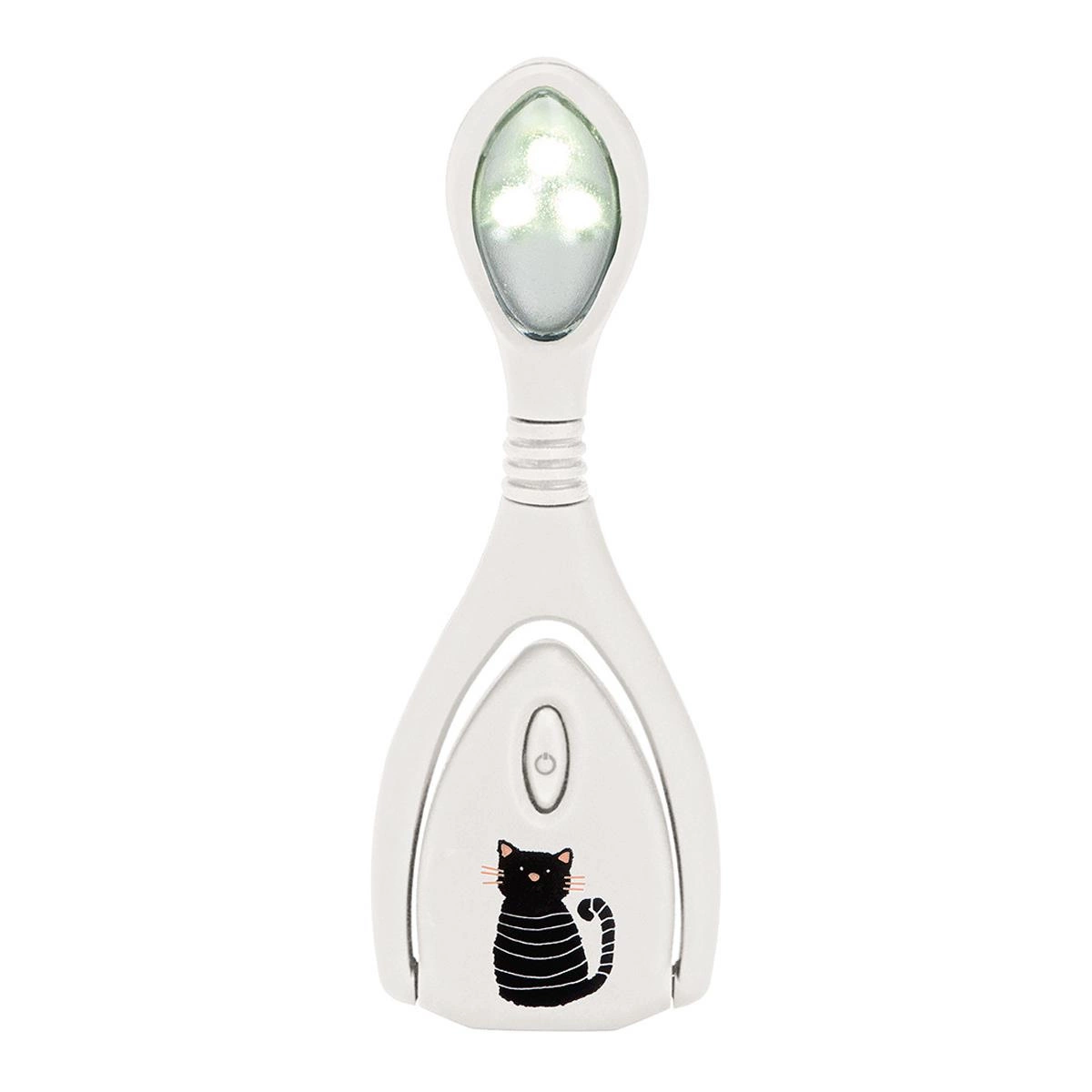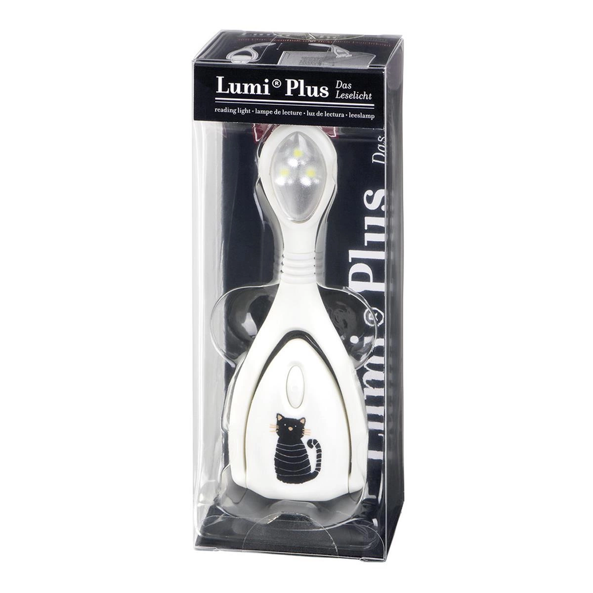 Lampka do czytania Lumi Plus w kolorze białym z uroczym czarnym kotem, wyraża pasję każdego miłośnika książek do czytania.