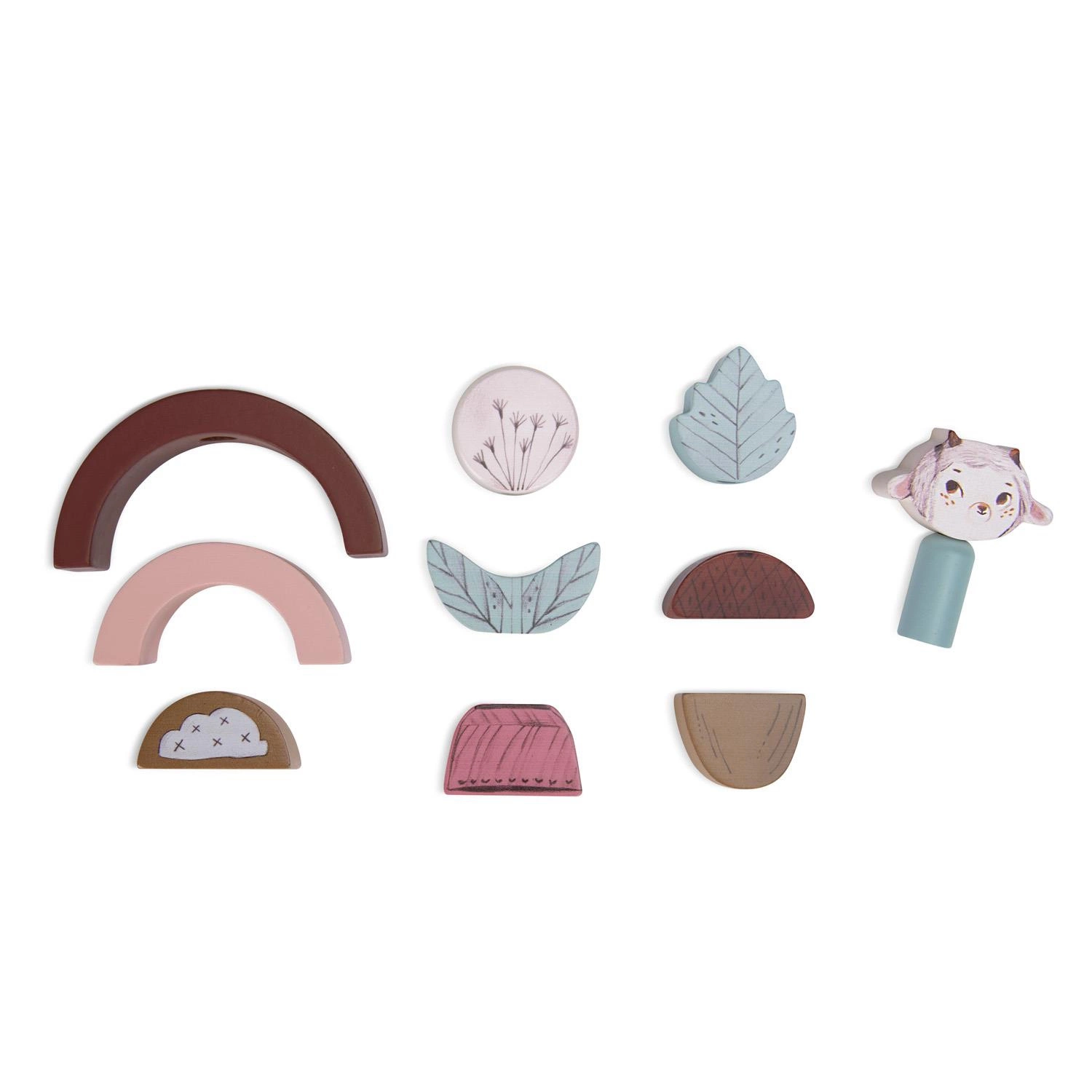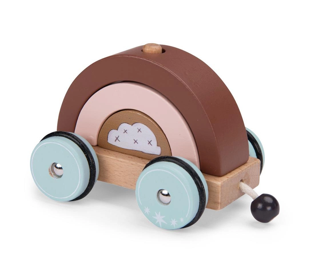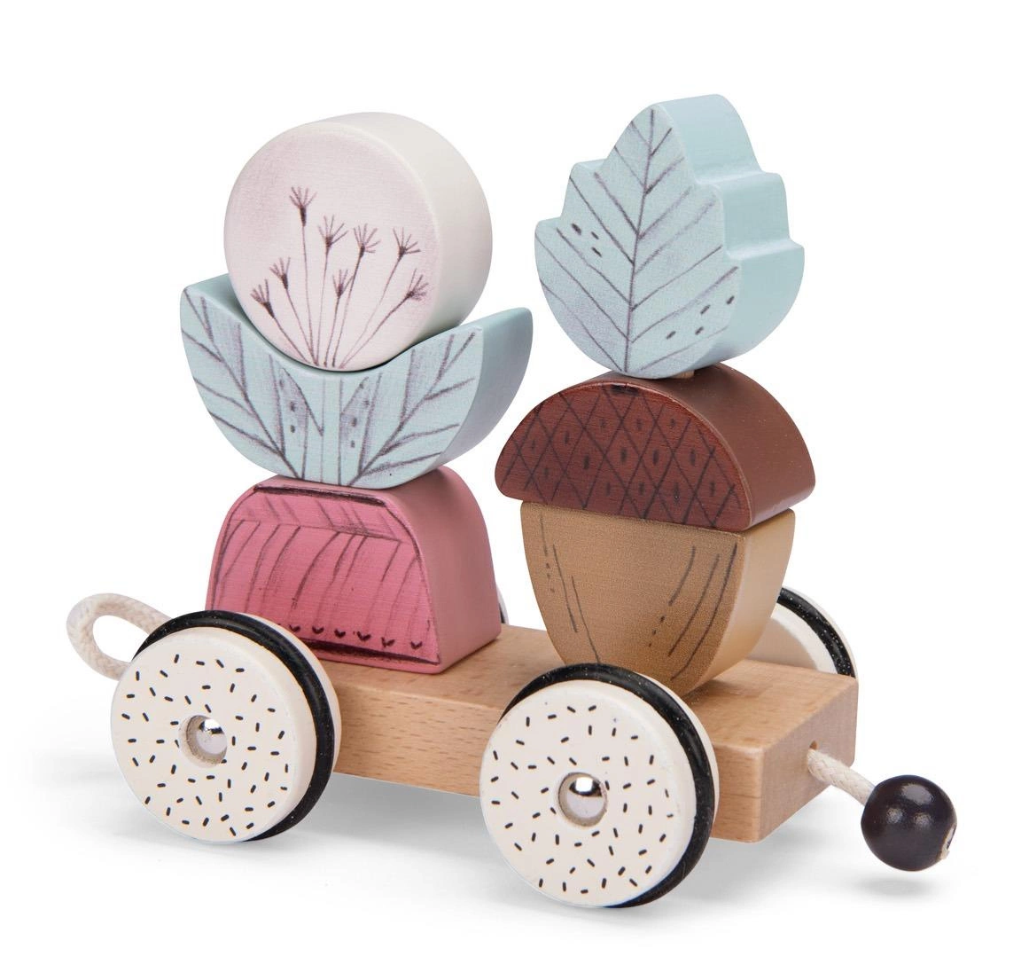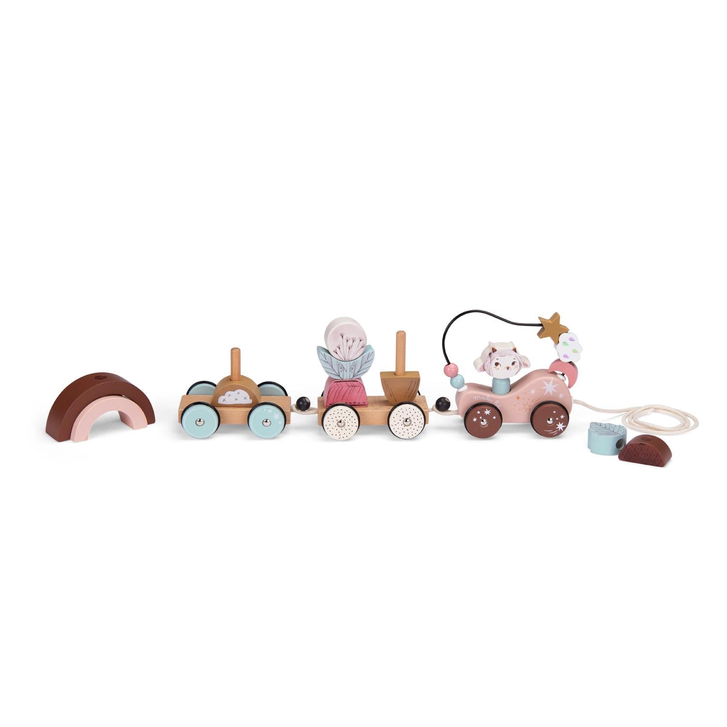 Drewniany pociąg posiada lokomotywę z dwoma wagonami. Każda część zawiera ruchome elementy do ułożenia np. tęczę lub rośliny. Wagony są odczepiane. Lokomotywa ma przyczepiony sznureczek, za który dziecko może ciągnąć cały pociąg.