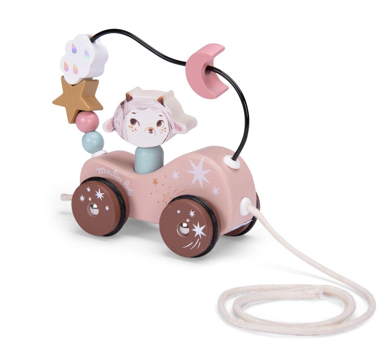Zabawka aktywizująca 2 w 1: pociąg do ciągnięcia wraz z układanką. Owieczka Nuage zaprasza do zabawy wraz z kolekcją Après la pluie autorstwa Lucille Michieli.