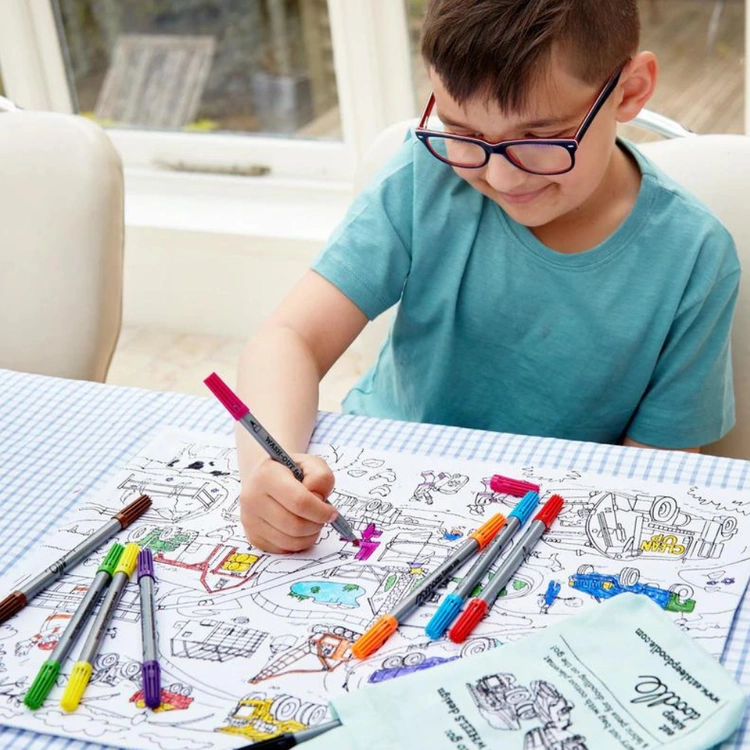 Podkładka na stół do wielokrotnego malowania zmywalnymi pisakami z zestawu. Wystarczy wyprać i wysuszyć materiał, a płótno jest znów gotowe do następnej artystycznej podróży. Bawełniana podkładka wypełniona jest kultowymi pojazdami, od samochodów sportowych po koparki, autobusy, traktory i pojazdy służb ratunkowych. To świetna okazja, by poprzez zabawę poznać historię motoryzacji