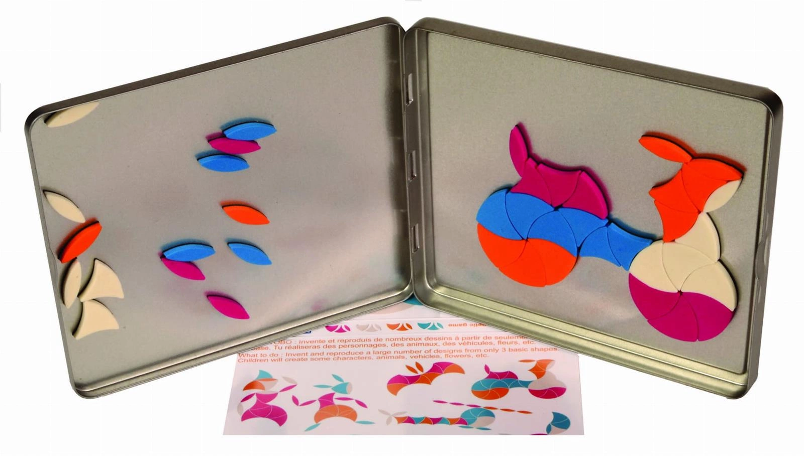 Metalowe pudełko zawiera 40 magnesów w 4 kolorach oraz 2 arkusze z 60 wzorami do odtworzenia. Zadaniem dziecka jest wybrać wzór, znaleźć pasujące magnesy i spróbować odtworzyć rysunek za ich pomocą. Gra praktycznie nigdy się nie kończy: poza 60 podanymi wzorami można też tworzyć swoje unikalne kompozycje.