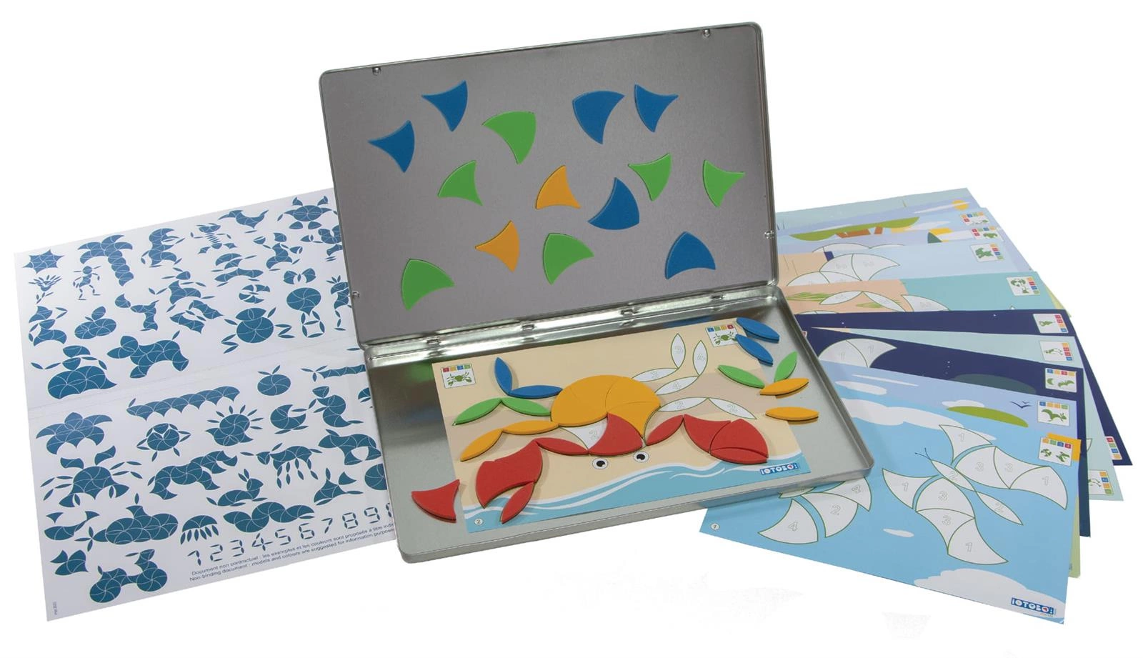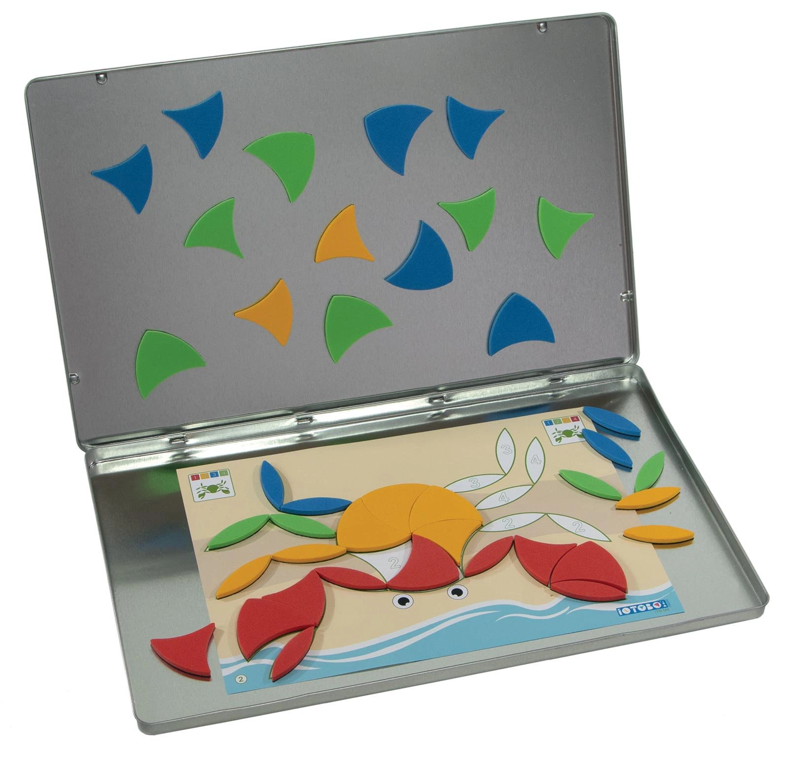 Zawartość: 1 metalowe pudełko (18 x 29 cm), 40 piankowych magnesów (3,5 cm) w 4 kolorach i 3 kształtach, 60 przykładowych modeli do ułożenia