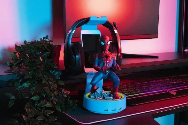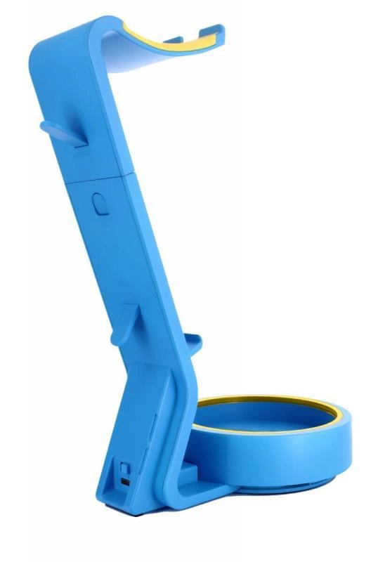 Oświetlenie aktywuje się, gdy dowolny kabel zostanie umieszczony w okrągłej podstawce. Stałe ramię jest teraz szersze i grubsze dla pewniejszego podparcia, rozciąga się aż do wyściełanej silikonem podstawki pod słuchawki na górze.
