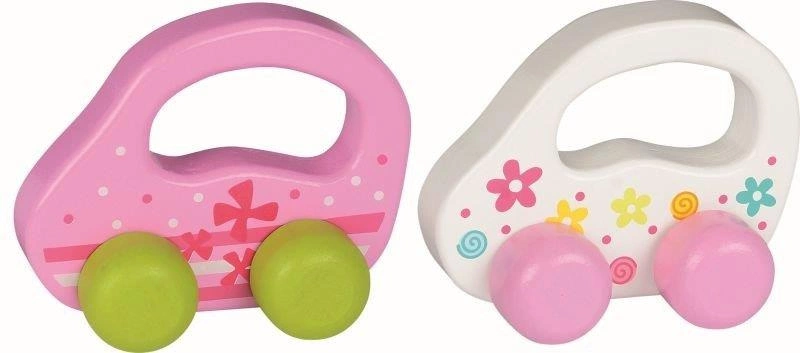 Drewniane pojazdy do rączki w dwóch kolorach.