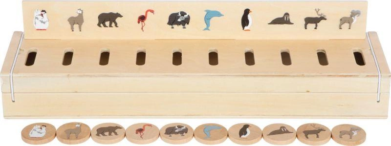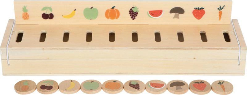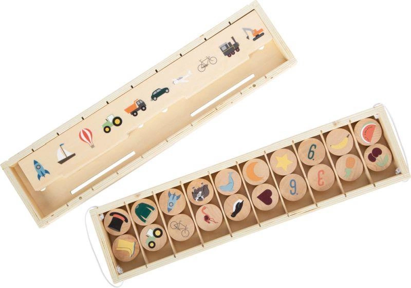 Najwyższej jakości drewniany pojemnik skrywa aż 60 żetonów z obrazkami o zróżnicowanej tematyce, a także 3 dwustronne panele jako wzory do dopasowywania. Dziecko ustawia podłużny panel w przeznaczonym do tego miejscu, następnie zaś dopasowuje to, co widzi na panelu, do odpowiedniej płytki. Płytki wrzucamy do otworów.