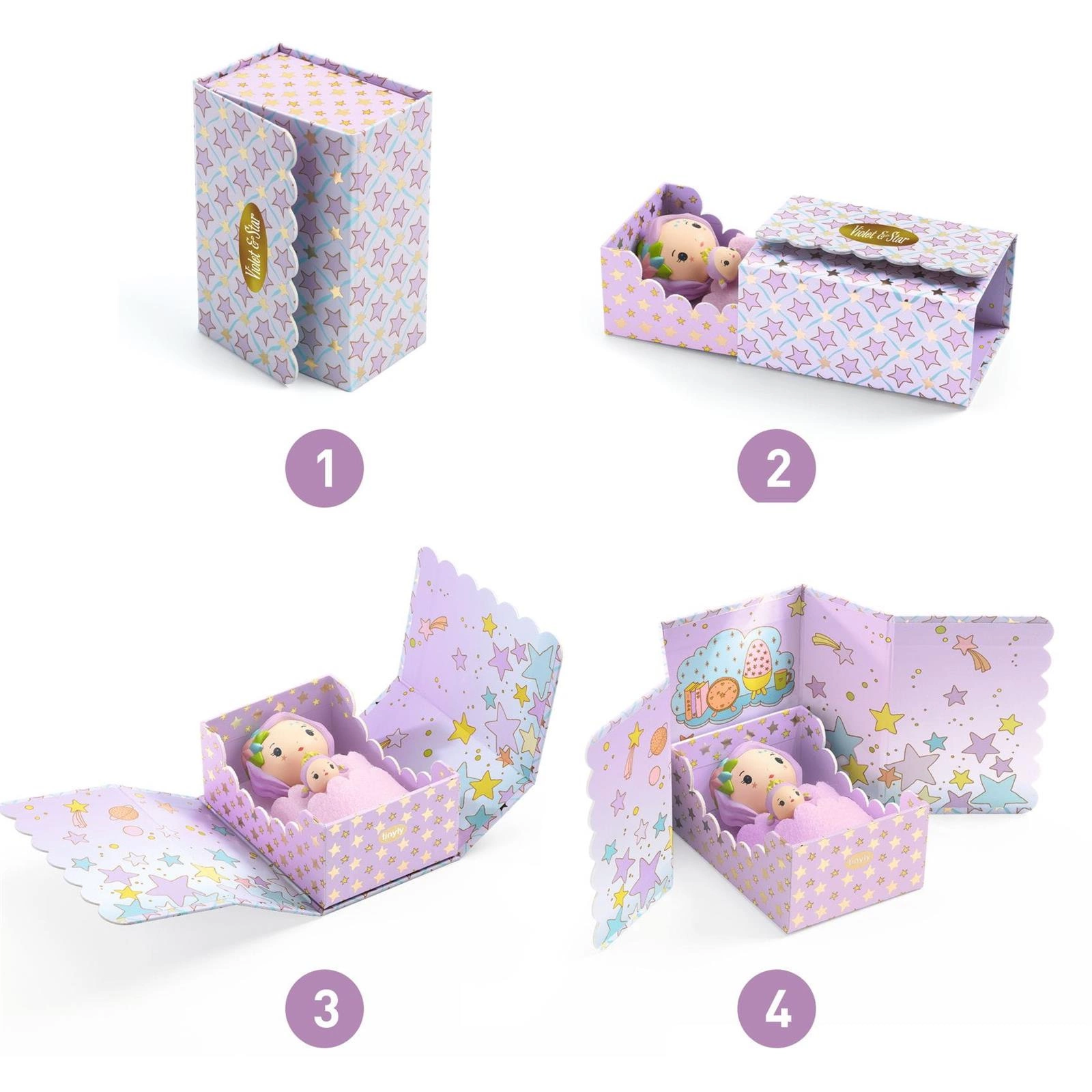 Minipokoik Violet i jej towarzyszki Star ukryty w uroczym magnetycznym pudełku. Otwórz je i odkryj przytulne wnętrze ozdobione bąbelkami i umeblowane wygodnym łóżkiem z kołderką. Pudełko jest łatwe w transporcie - można je zabrać ze sobą wszędzie. Wykonane z papieru i kartonu posiadającego certyfikat FSC®.